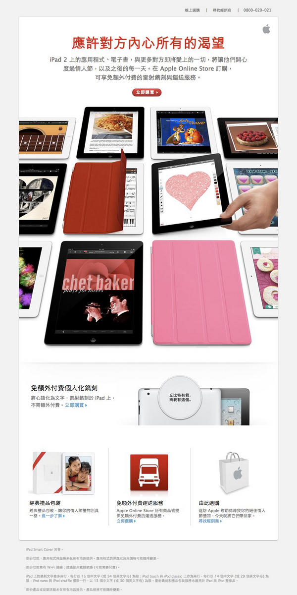 平常我都會按時收看 Apple 寄來的 eDM 電子報,因為裡頭總是會有一些很棒或很有趣的文案。而今天,我是收到有關西洋情人節檔期促銷的「iPad 2 送禮加刻字服務」eDM: 我好喜歡裡面的這一句: 「丘比特有箭,而我有這個。」 太傳神,太點題了。 探索更多來自 那些在我身上的底片效應 的內容 訂閱即可透過電子郵件收到最新文章。 輸入你的電子郵件地址… 訂閱電子報