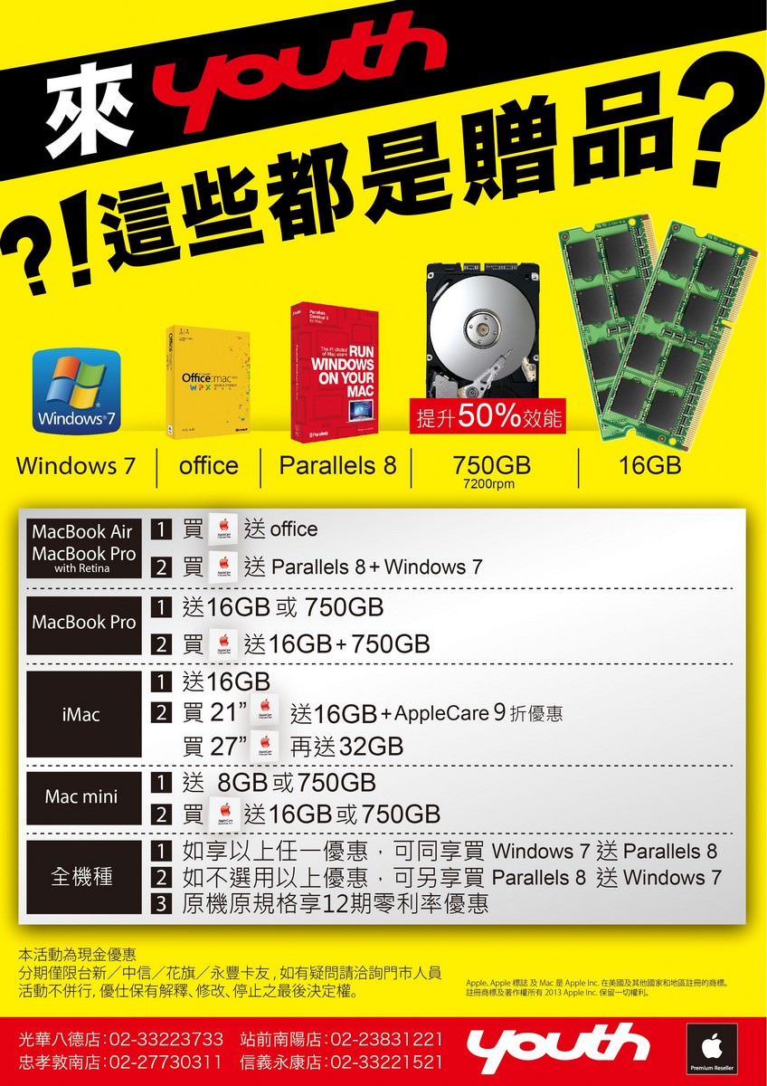 - 隨機加購 AppleCare(NT$8,590),送 Office for Mac(價值 NT$4,490)或 Parallels Desktop 8+Windows 7(價值 NT$5,678)