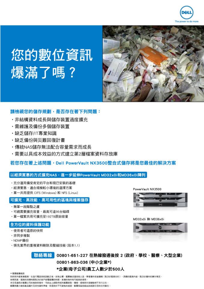 排版部分,這篇廣告的排版方式真的很簡單,右上方放了一張應該是圖庫買的圖,有個穿西裝的外國人深陷廢紙堆中,伸出右手求救,不過因為我是快速仿製,因此沒有時間好好去找圖庫(有沒有人有推薦的圖庫?免費和付費都可以),所以我隨便找了一張垃圾堆的圖片,示意一下。而排版文字的部份,從中間開始就是一連串的幾行字一直下來,比較能夠注重的地方在於中間下面,從「以經濟實惠的方式...」開始,直到「全方位的資料保護功能」,在這邊是使用三三三原則(95% 是),列出三點效益,根據每一點再丟出三點說明,對了,三三三原則是我自己說的,只是我自己幫助記憶而已,實際上應該是沒有這個原則才對 XD。