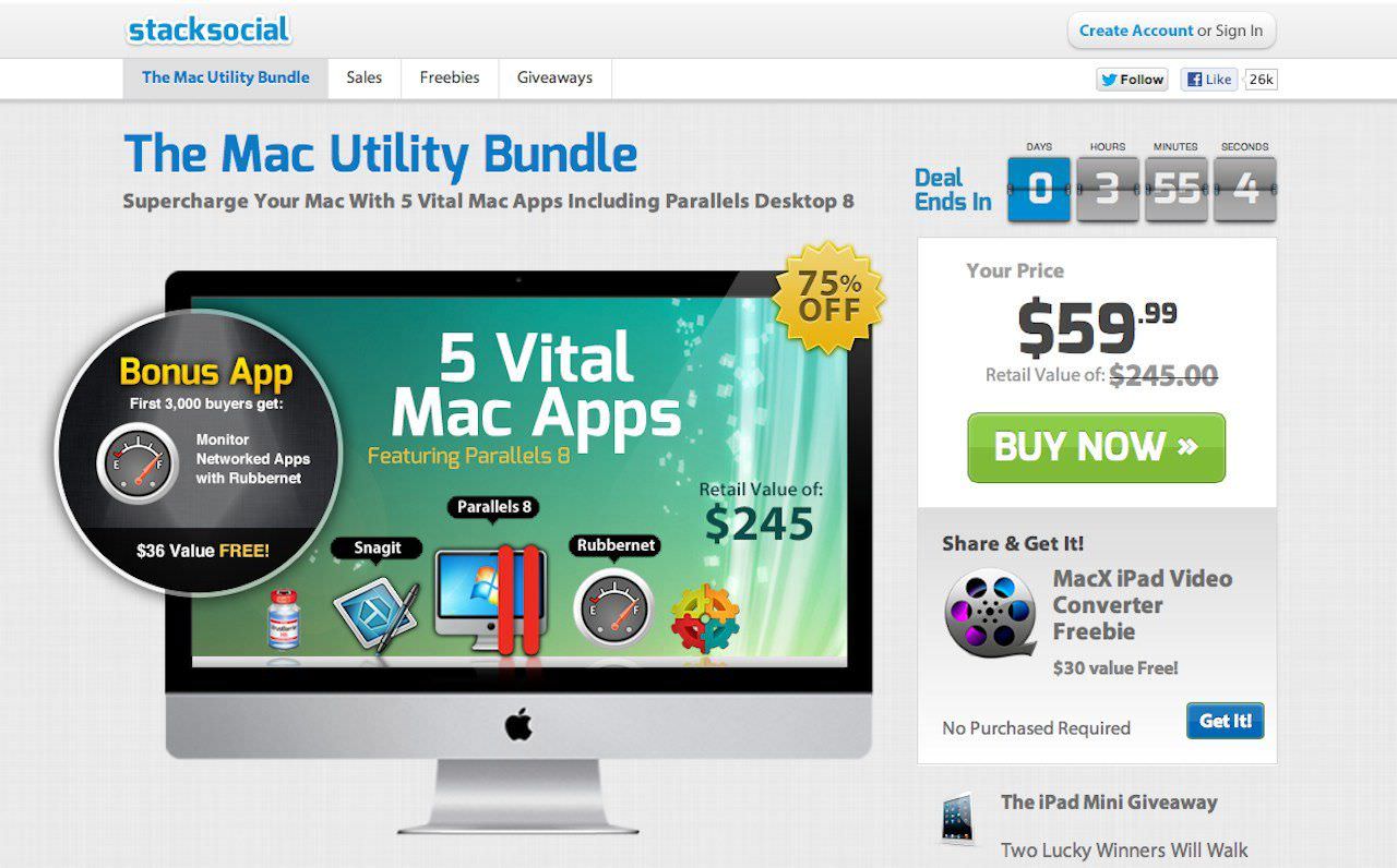 Stacksocial 網站推出限時特價軟體組合包,Parallels Desktop 8 for Mac 加上其他四套軟體只要 59.99 美金(按此連至購物頁面),時間所剩不多了,要買要快...