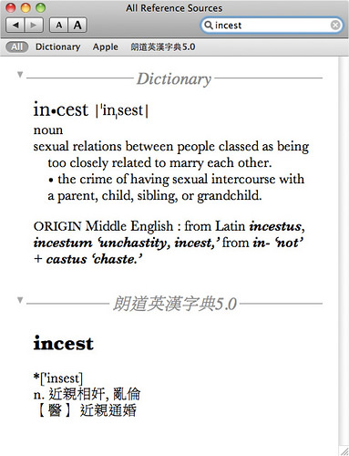 我以為這字是日本人發明的,沒想到 "incest (近親相姦)" 的起源竟然可以追朔到好幾百年前的 中古英語時期 (Middle English)。都是 FAIL Blog 教我這個字的...