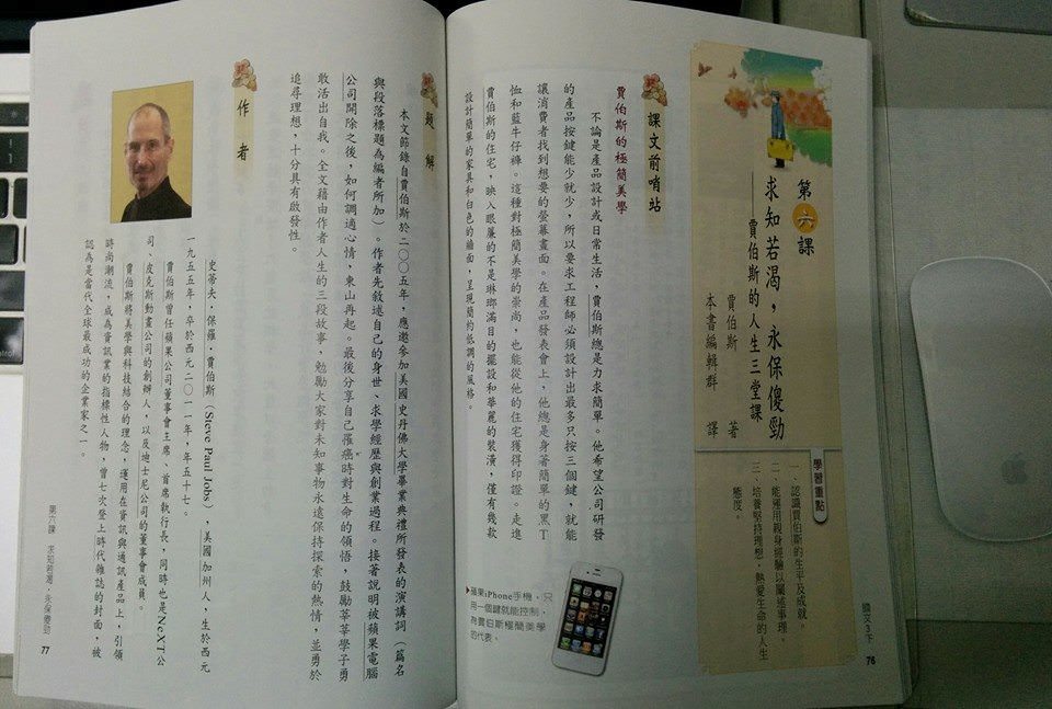 前幾天看到沈志宗分享了現在國三的國文課本,裡頭竟然有一課是賈伯斯史丹佛的演講,課文名稱為「求知若渴,永保傻勁-賈伯斯的人生三堂課」,看到賈伯斯被放在作者欄位,還有題解,真是太有趣了!