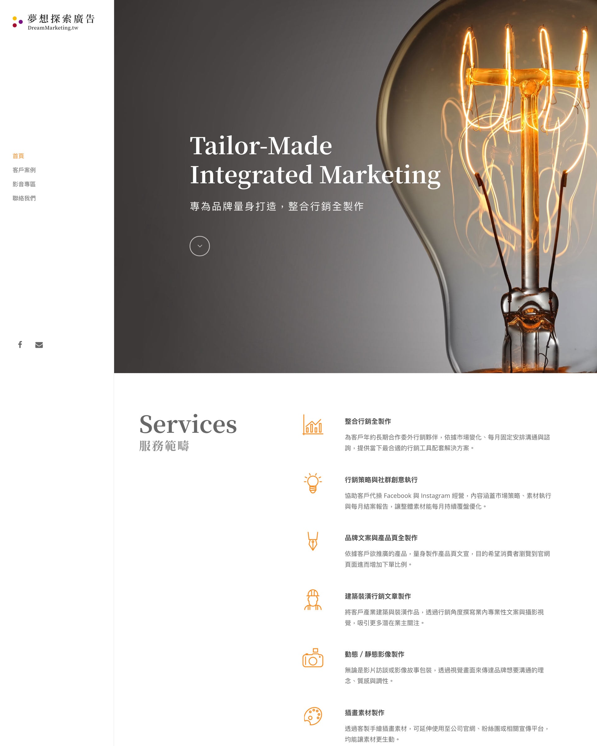 夢想探索廣告,是一位我在讀書會認識的朋友所經營的公司,因為這個機會,所以幫他們設計了網站(謝謝 Mandy!)。由於夢想探索廣告主要的業務內容是提供整合行銷服務,因此,整體網站的架構核心可以簡單切成兩部分:首頁與客戶案例。畫面擷圖如下,