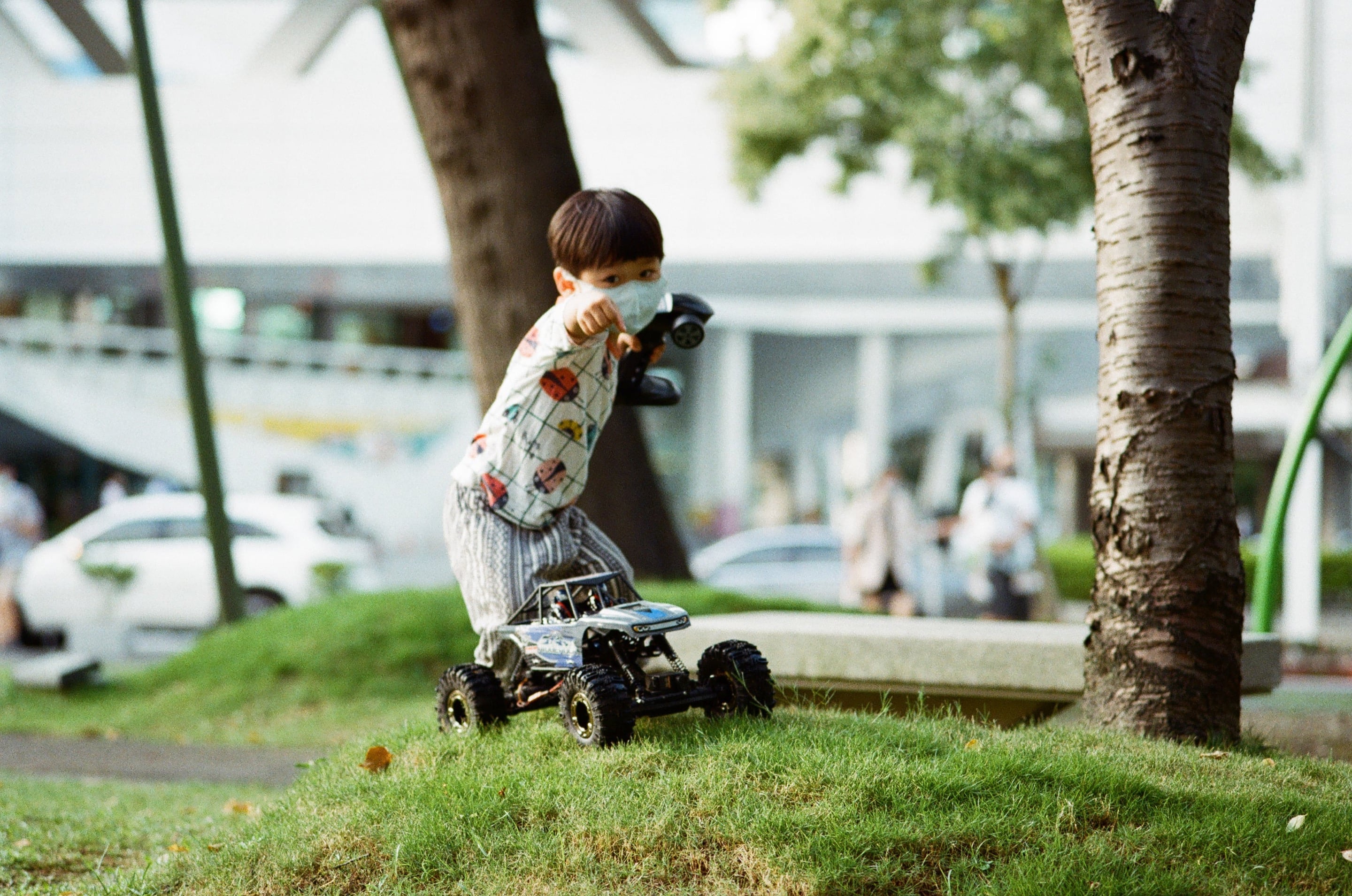 必須說,南港的三重世貿公園很適合玩搖控車,有很多不難的地形可以玩,兒子最近拍照很喜歡擺這個姿勢。Olympus 100mm f2.8