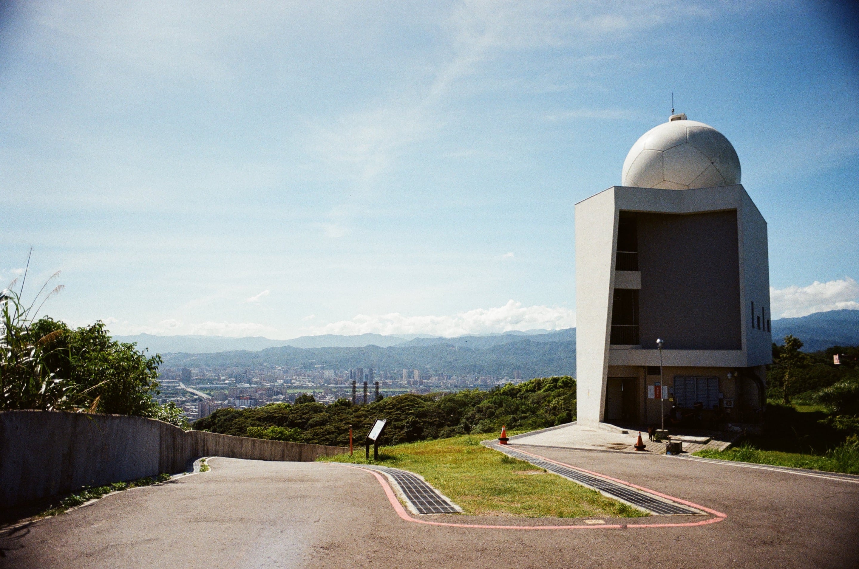 底片風景測試,圖為樹林防災降雨雷達站。Olympus 28mm f3.5 + ND8 減光鏡(1/500s,f3.5)