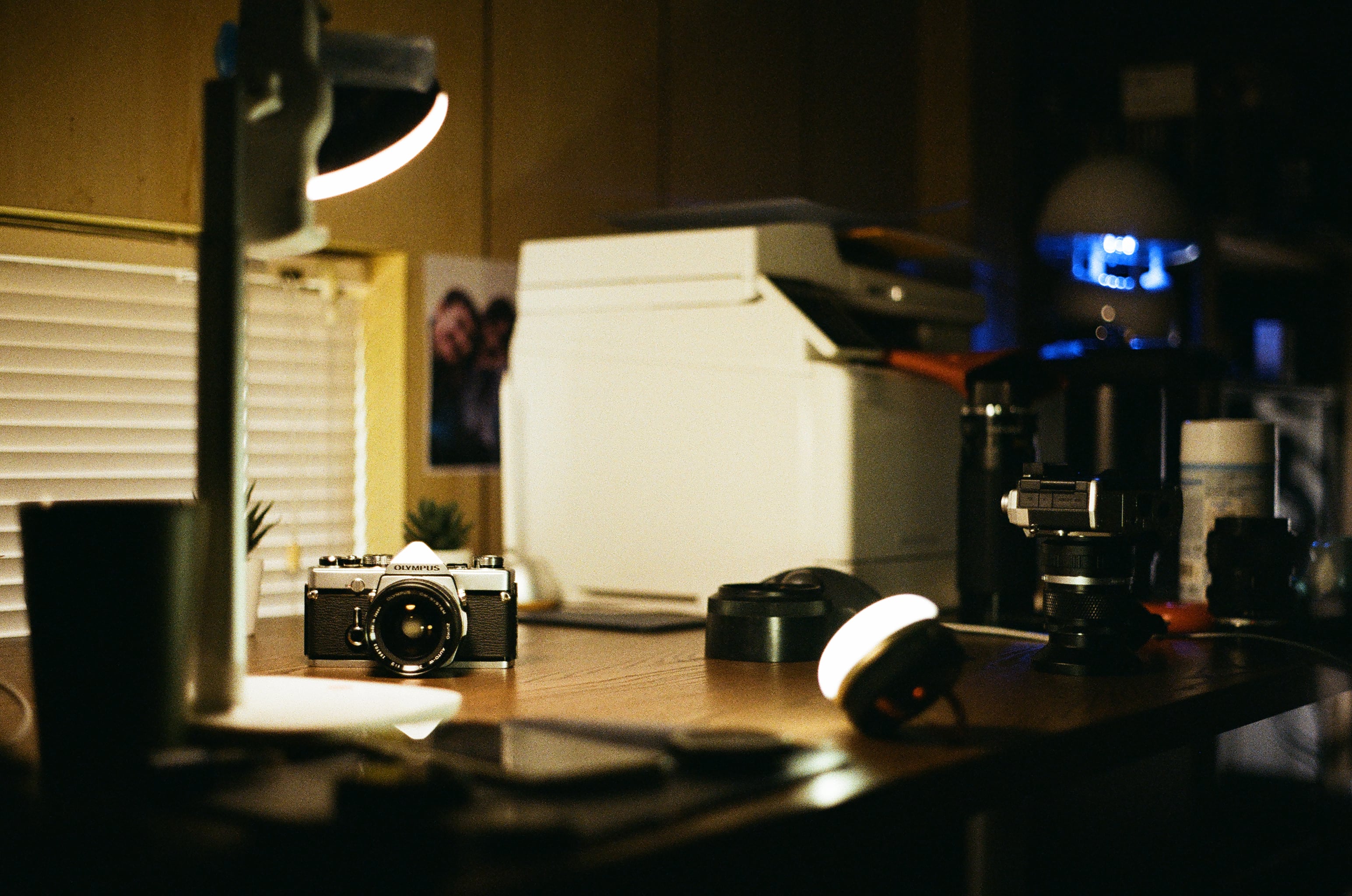 很喜歡這張照片,平常我就用我的工作桌,架上一兩顆很便宜的露營用 LED 燈,拍些二手商品照放在蝦皮上賣賣看。圖為正在拍攝一台要賣的 Olympus M-1。這照片,我可以使用了一顆有明顯霉斑和邊緣霧化的鏡頭,想試試看它的糟糕鏡況到底會不會影響拍攝,從這張開始之後的照片,都是使用同一顆鏡頭拍的。