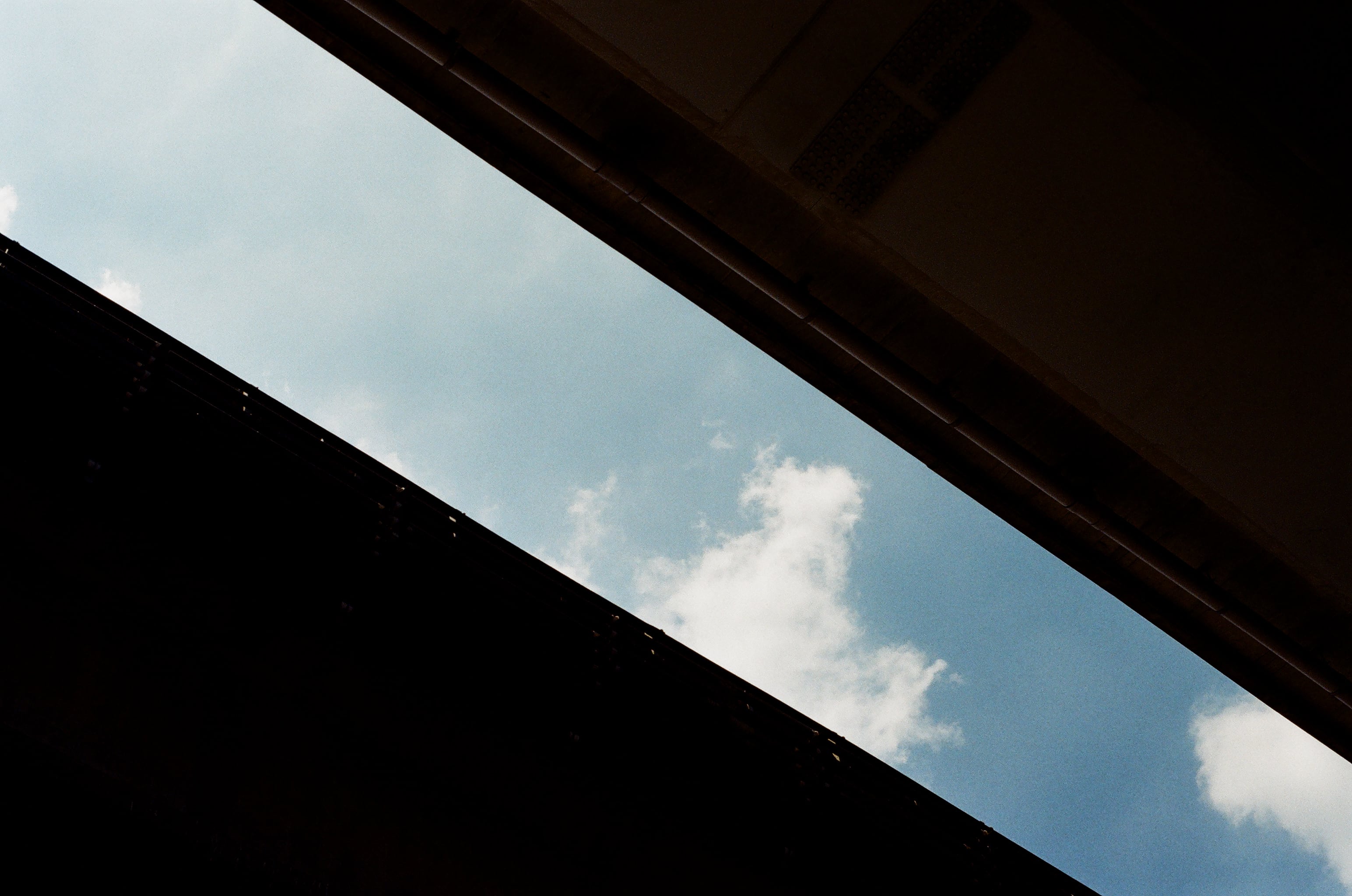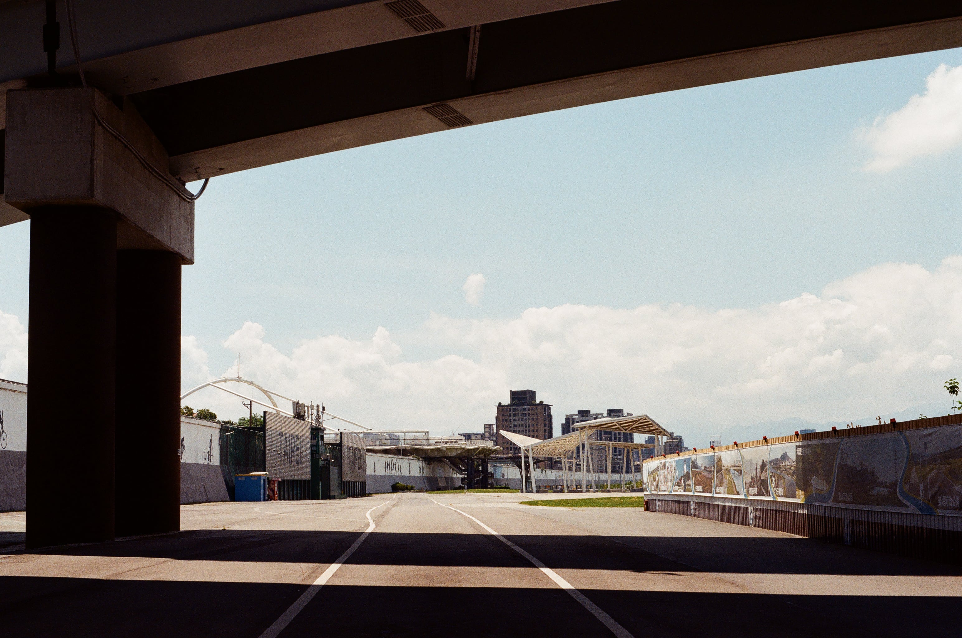 回程途中,因為接近中午時分了,烈日實在太烤,我躲在橋下,看著天空,休息一下。用到現在,我大概知道 Olympus OM-10 光圈先決模式的使用訣竅了,面對大白天,原則上都要去抓到縮光圈之後的極限快門,不然根本拍不出藍色的天空,以前不懂事,總是很堅持要用大光圈來拍,結果就是一片慘白。