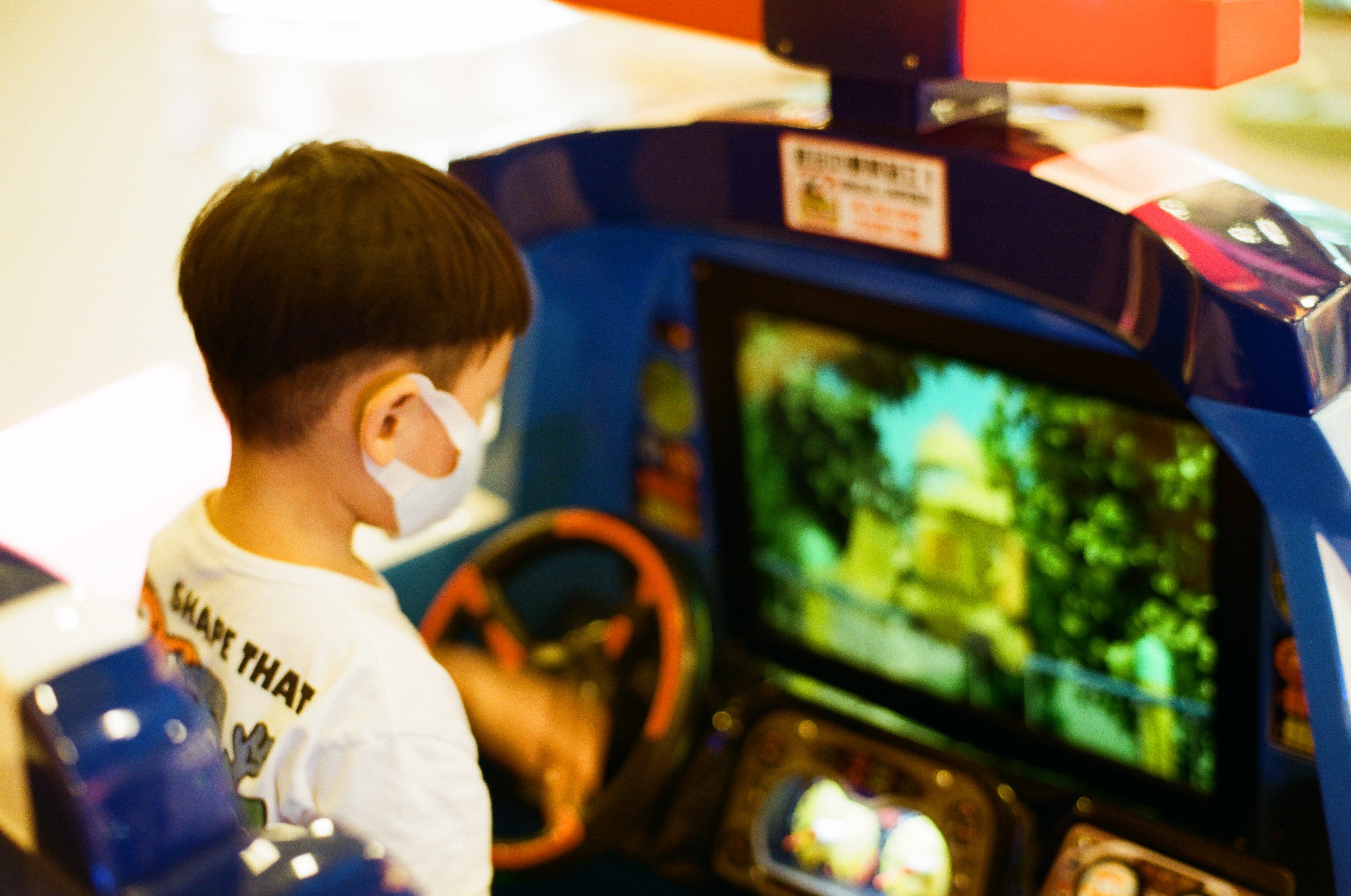 現在的電子遊樂場,裡頭的機台九成都是大陸機,不精緻,懷念早期都是日本機台的青春年代。兒子就是那麼看著看著,也沒讓他玩,因為我覺得玩一次太貴了(50~60 元)。Olympus 55mm f1.2(1/30,f2)