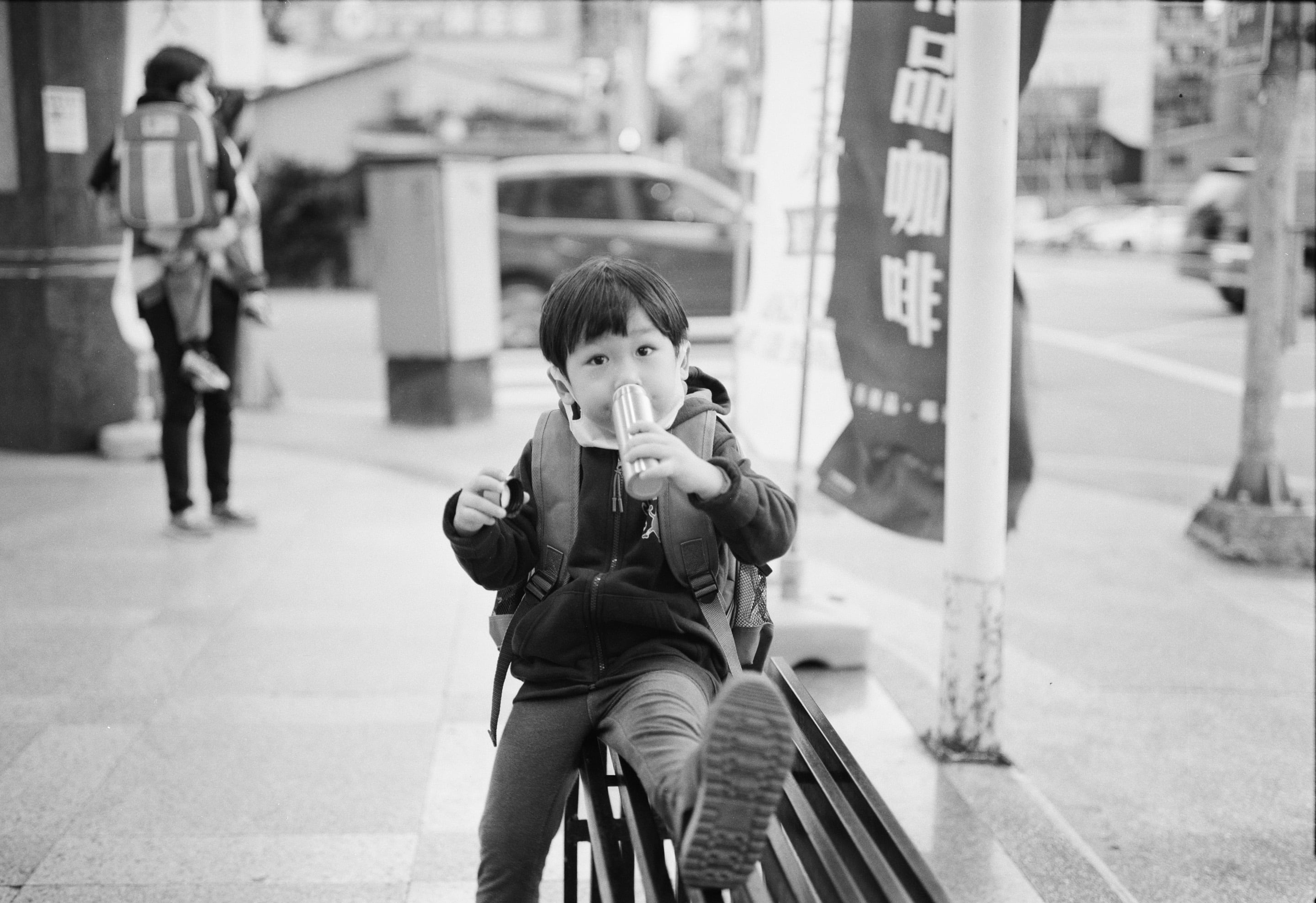 接到兒子了,我們正在等待過馬路,我認為兒子有個很好的習慣值得表揚,就是他很愛喝水,所以我身上都會隨身攜帶一小罐水,如果他身上的水喝完了,我就可以拿我的水支援。Fujica GW690 90mm f3.5(1/60,f3.5,+1 EV)
