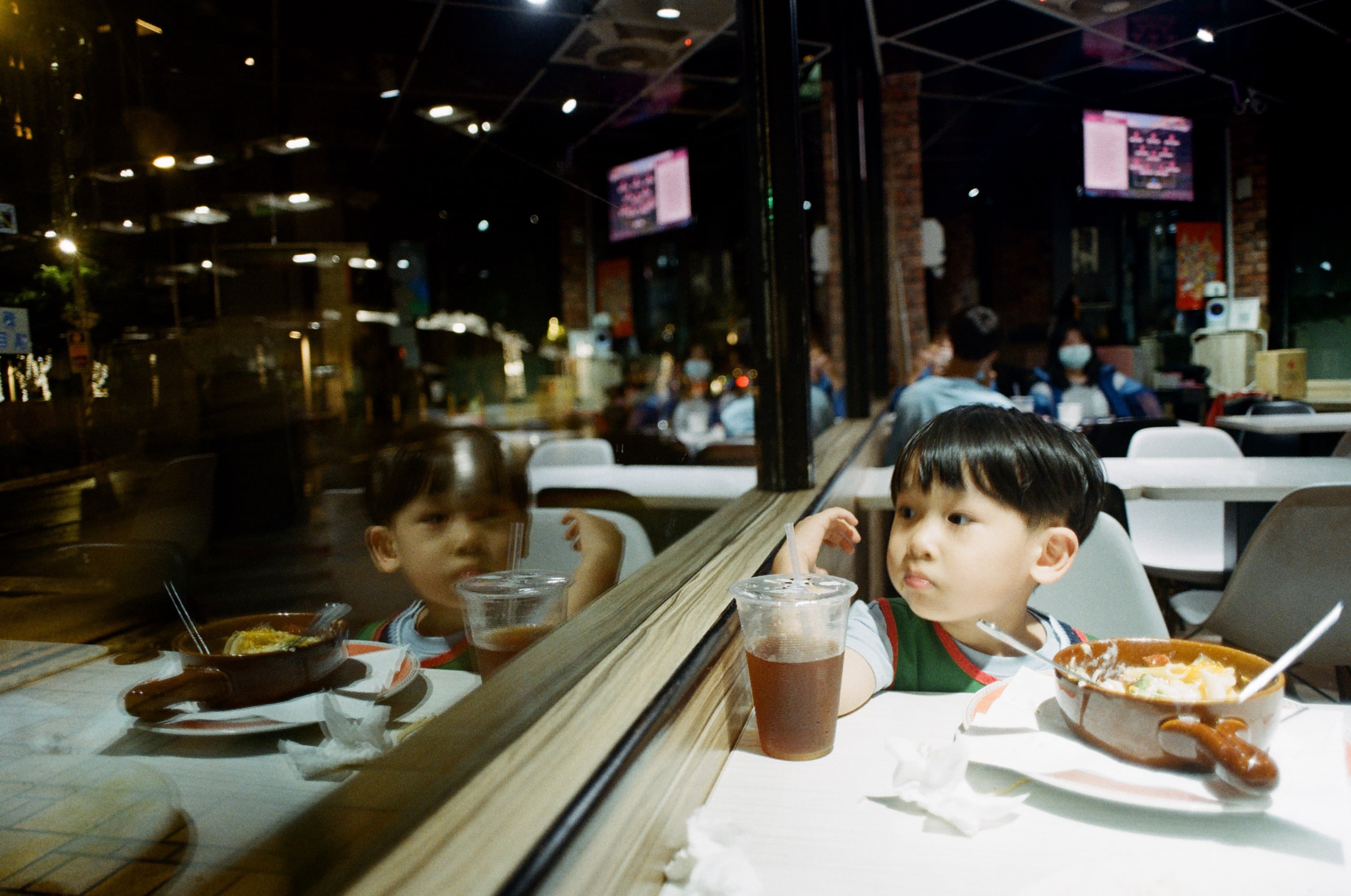 兒子桌上那杯是平價義大利麵附送的冬瓜茶,我小時候一直誤以為冬瓜本身可以煮出甜味,大概過了 30 歲之後才認真發現那都是砂糖而已,冬瓜茶既沒有茶葉,也沒什麼冬瓜,應該正名為「冬瓜風味糖水」才對。Olympus OM 24mm f2.8(1/4,f2.8)