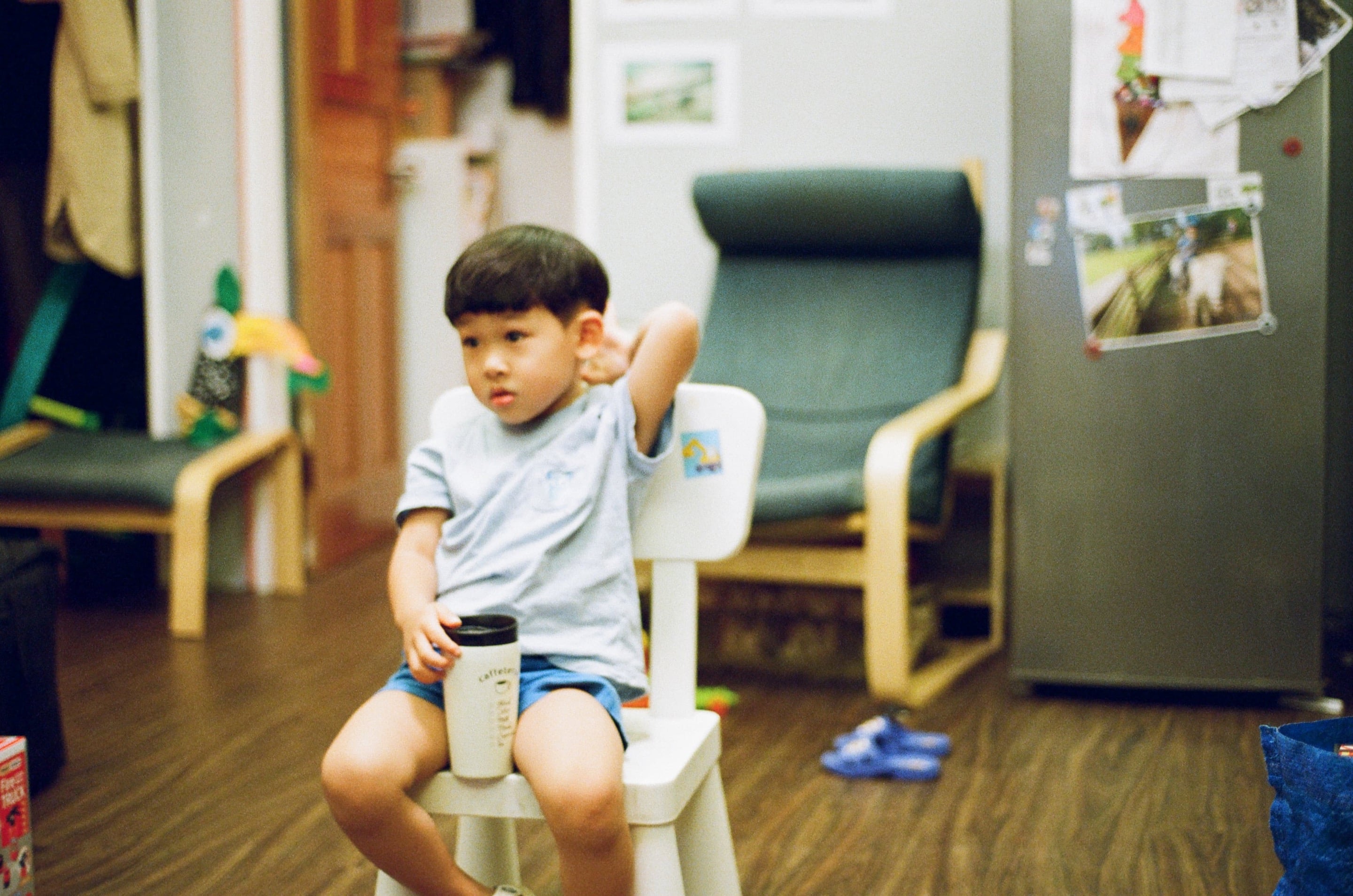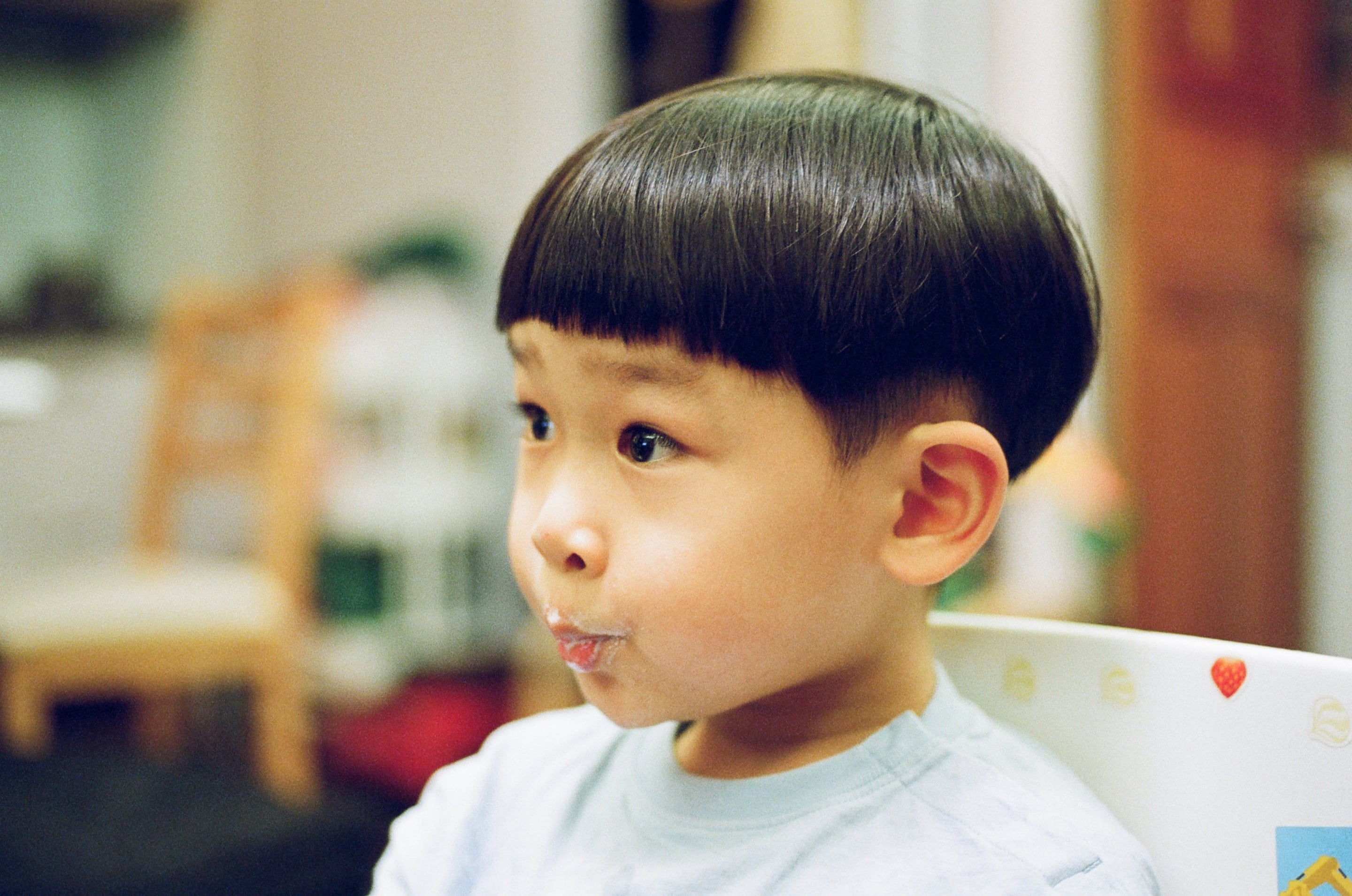 兒子頭髮長了,等一下要準備在家剪頭髮。Olympus OM 50mm f2 Macro(1/30,f2)