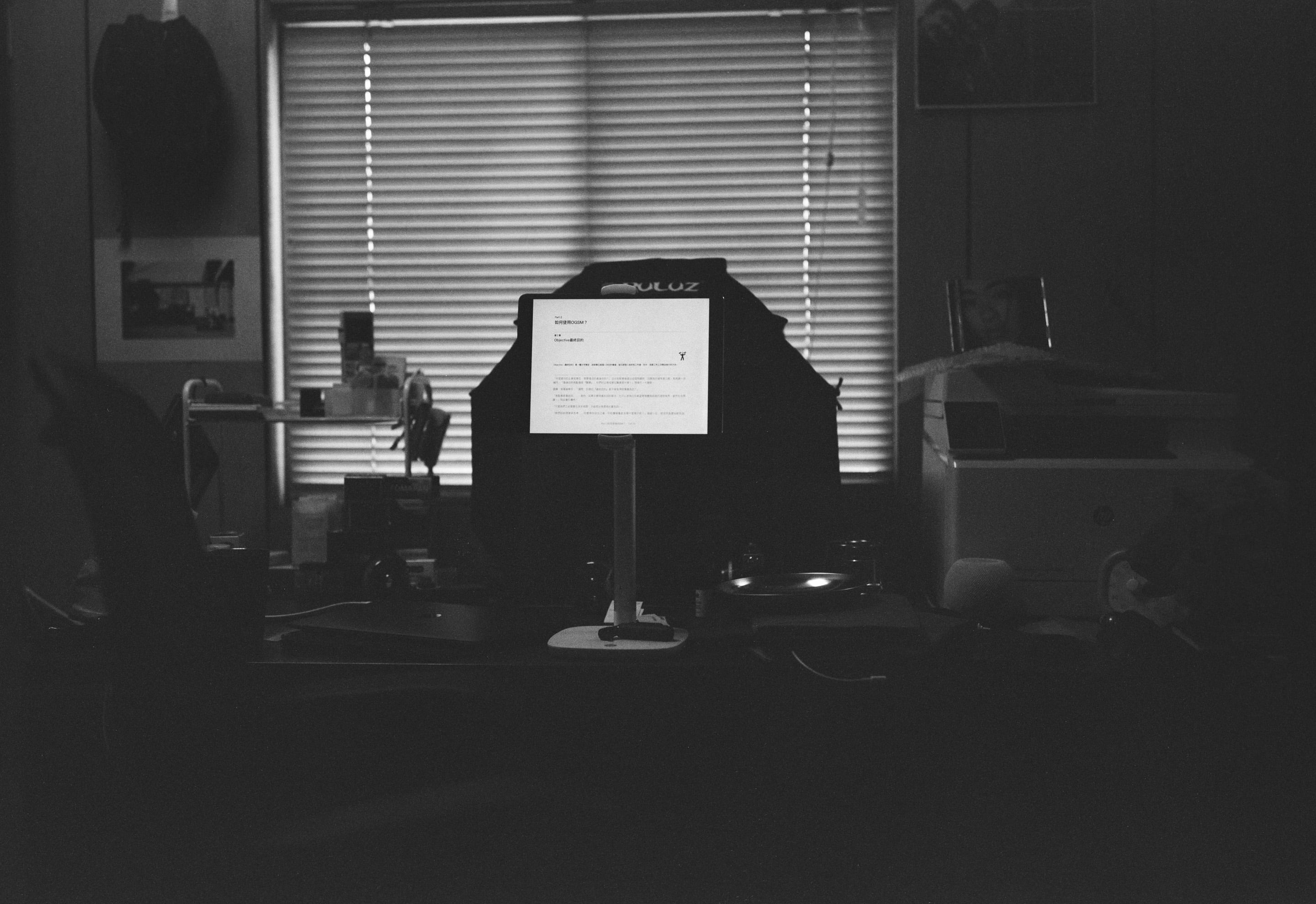 正在用 iPad Pro 看電子書的我,正在看張敏敏老師的《OGSM 打造高敏捷團隊》這本。由於是拿手機對著 iPad 螢幕測光,因此就拍成這樣子了,或許改把 iPad 螢幕亮度調暗再拍才對。話說 GW690 系列的最近對焦距離都不近,長達 1 公尺,這張照片我記得是最近對焦距離下拍攝的。Fuji GW690II + Fujinon EBC 90mm f3.5(1/125,f3.5)