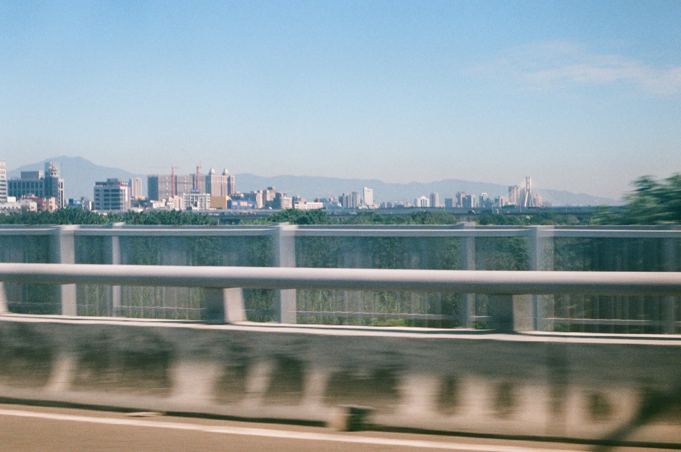 新海橋上,我左手握著方向盤,右手拿相機,眼睛看著前方,鏡頭對左邊盲拍,因為我覺得那些山和城市好美。Canon FD 50mm f1.8(f22)