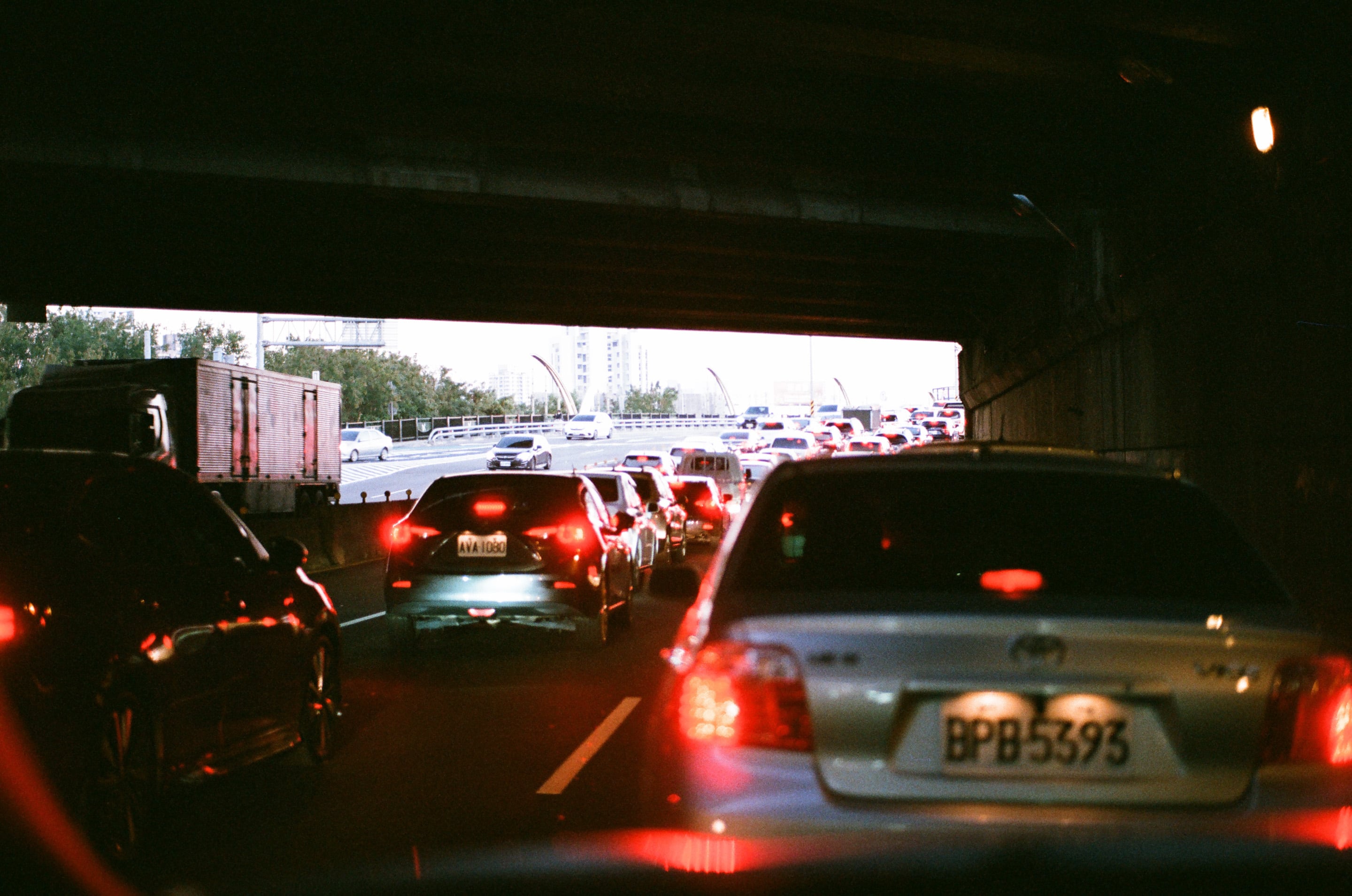 自從開始拍底片之後,我就相機不離身了,我特別買了一個只需要魔鬼氈就可以開關的郵差包,方便我看到什麼畫面,想拍就拿出相機按下快門。圖為某天開車,我只是覺得車很多,很無聊而已。Olympus OM 50mm f2 Macro(1/125,f2)