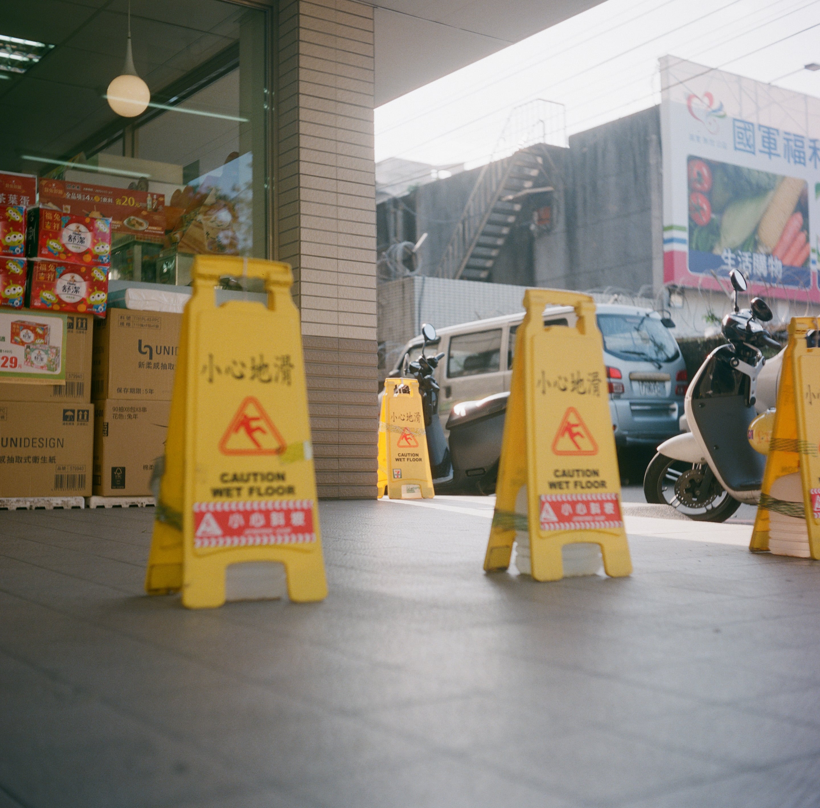 這是一間我家裡附近的 7-11,我如果在網路上賣東西,都會約這家 7-11 面交。偶爾也會特地走 15 分鐘的路程到亞東醫院捷運站去面交,因為我想趁機散步。話說這些「小心地滑」的警告牌是全年常駐的,因為店主不希望機車隨意停放。我看它們擺得整齊是也賞心悅目,就拍了。