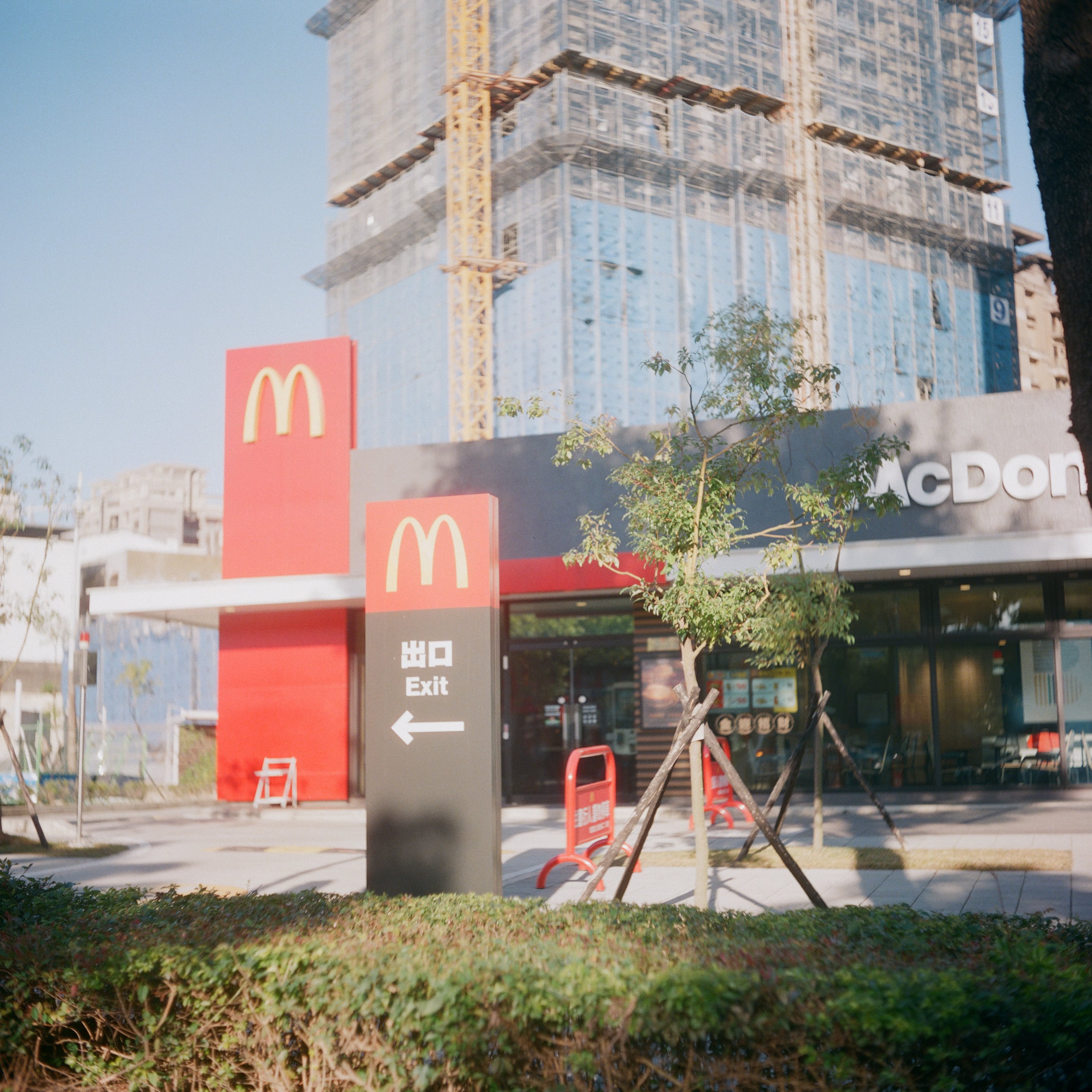 慶祝我睽違一年半被封印在家,現在終於又可以重回出門上班的日子,今天的上班地點是新北土城金城路三段新開的麥當勞。這張照片拍攝時,陽光非常強,我看了一下測光表是 +5.3 EV,測試一下 Lomography 800 對於曝光過度的寬容度。