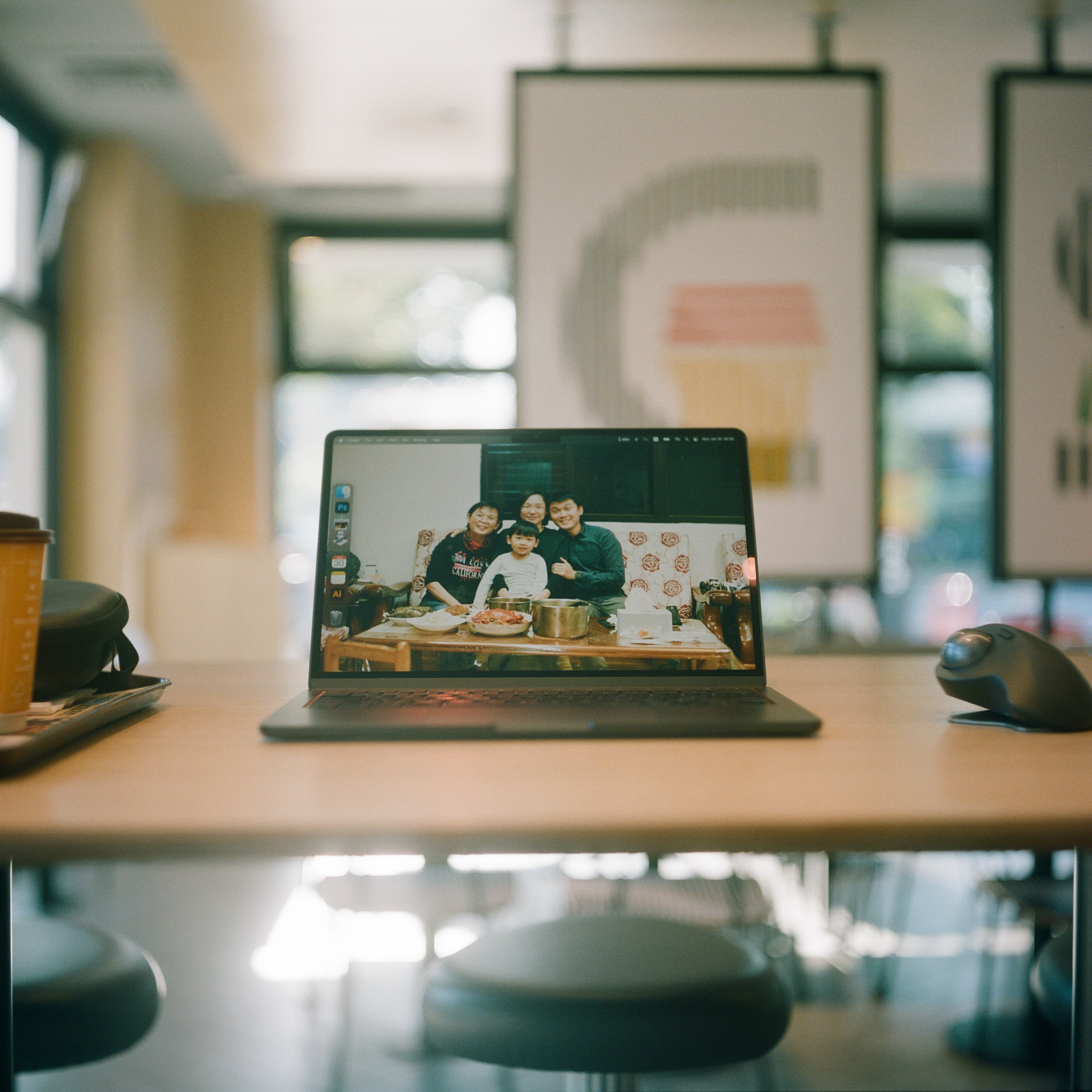正在工作到一半,覺得從落地窗透進來的陽光超級舒服,令人超有精神。電腦中的桌布,是今年除夕夜那天我用腳架和家人拍的合照,我很喜歡。