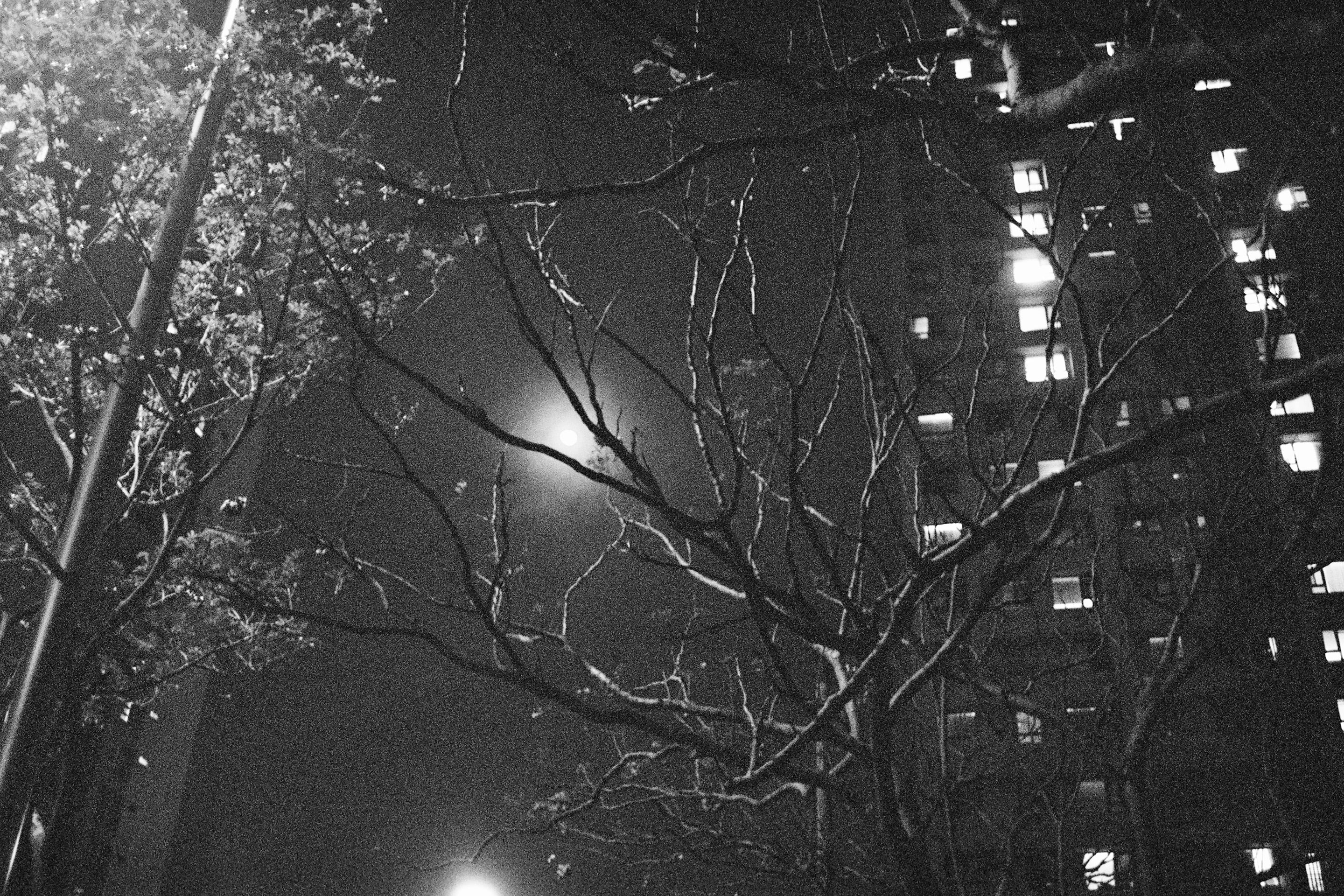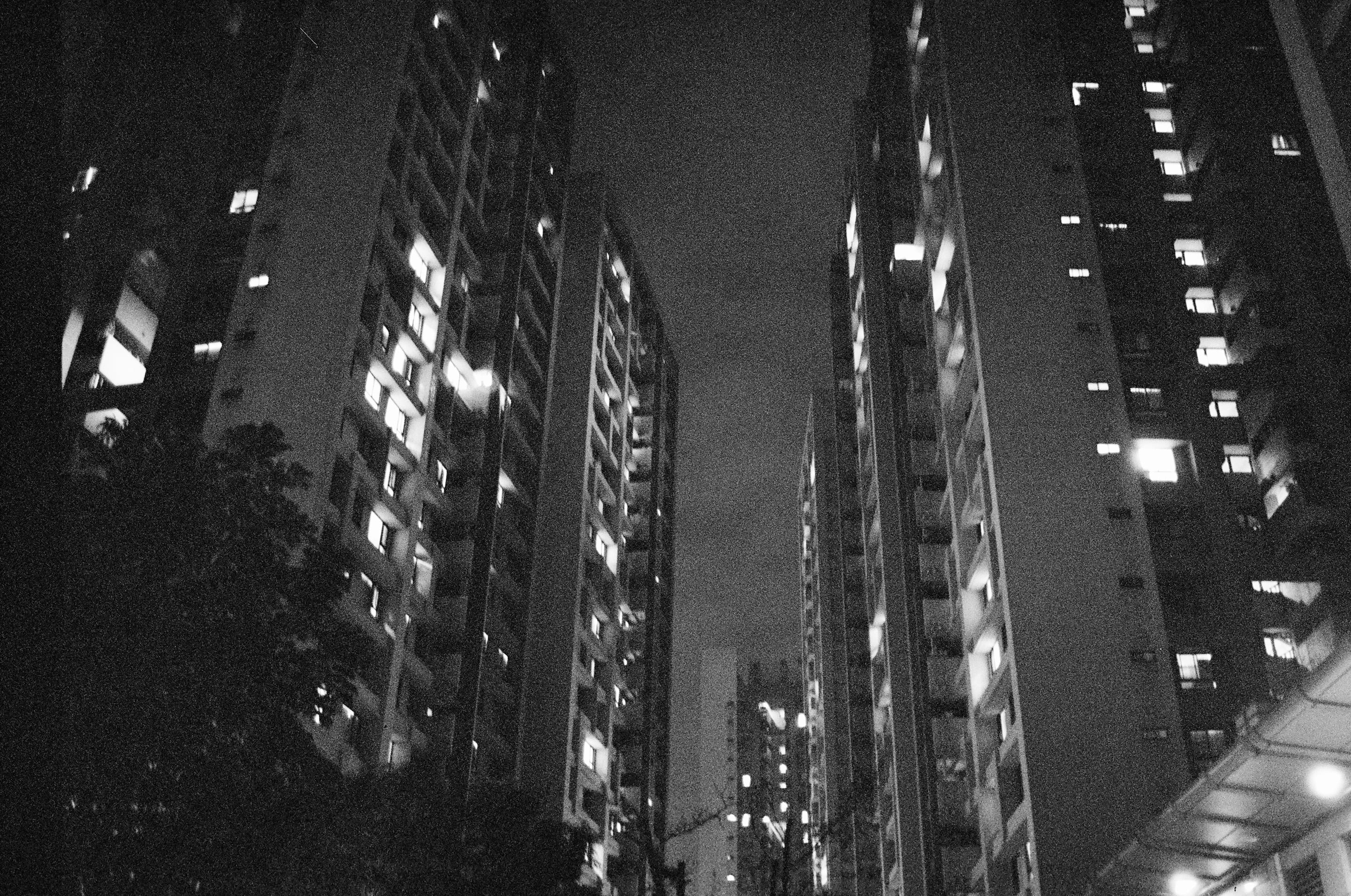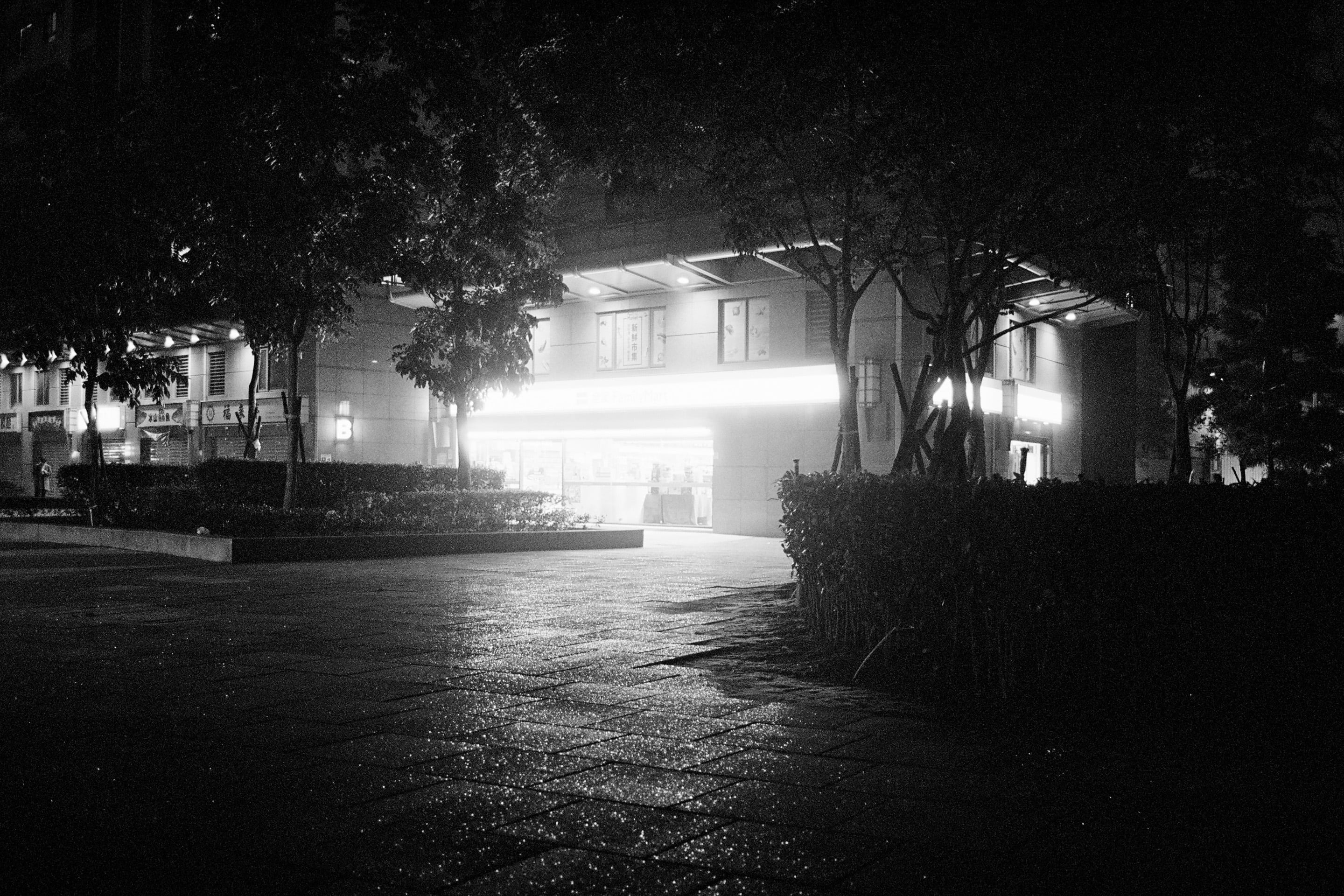 家裡附近的社區大樓,蹲下手持 1 秒快門。Olympus OM 35mm f2.8(1 秒,f2.8)