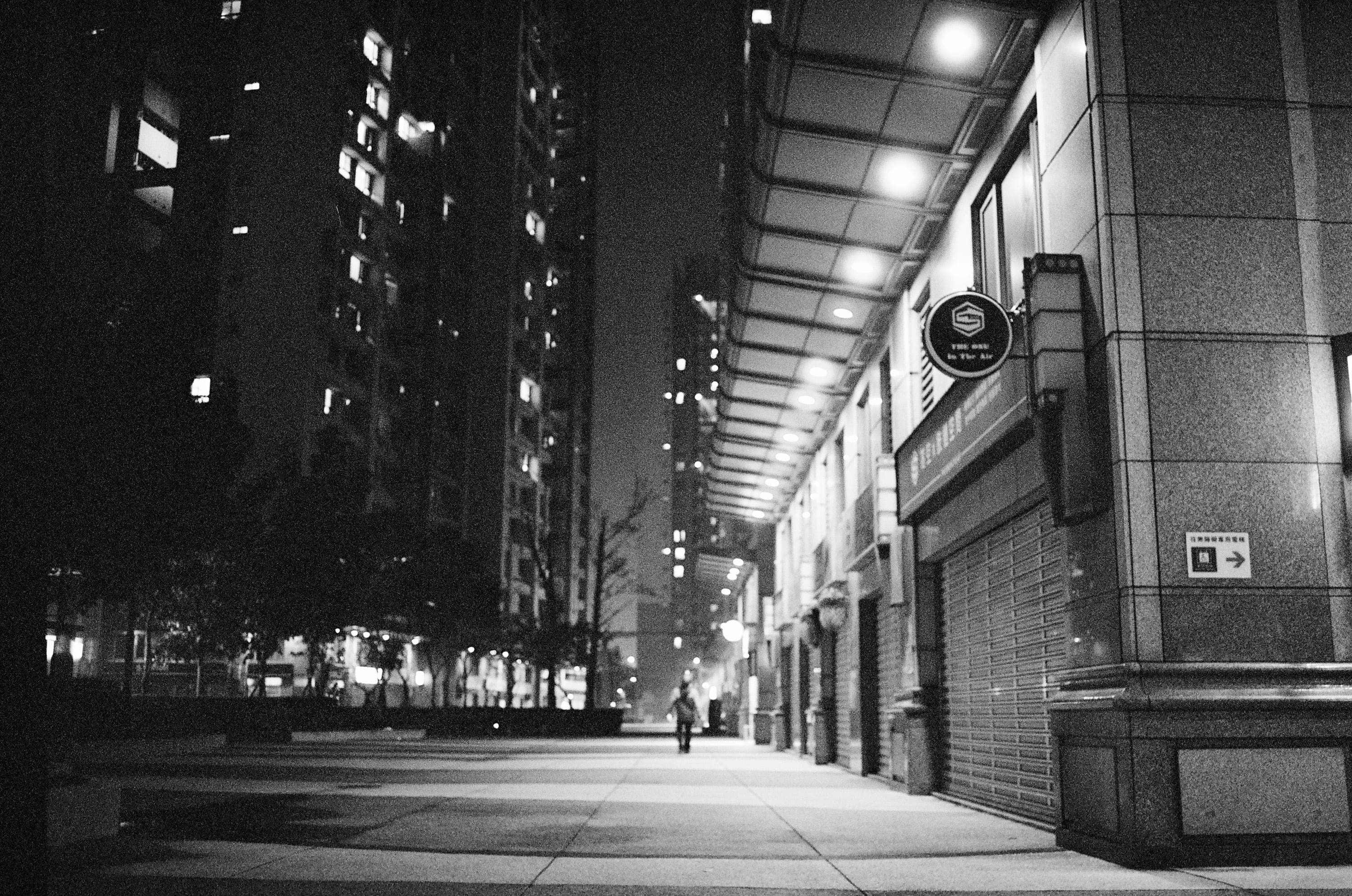 這是本次分享的最後一張照片,某天晚上失眠,我散步去家裡附近的 7-11,看到一名午夜還在跑單的外送員正走路去送餐,覺得他們很辛苦。當時拍這張照片時,我是蹲著並以手肘靠著膝蓋,所以才得以將快門速度降到最低,換取最多的光線進來。