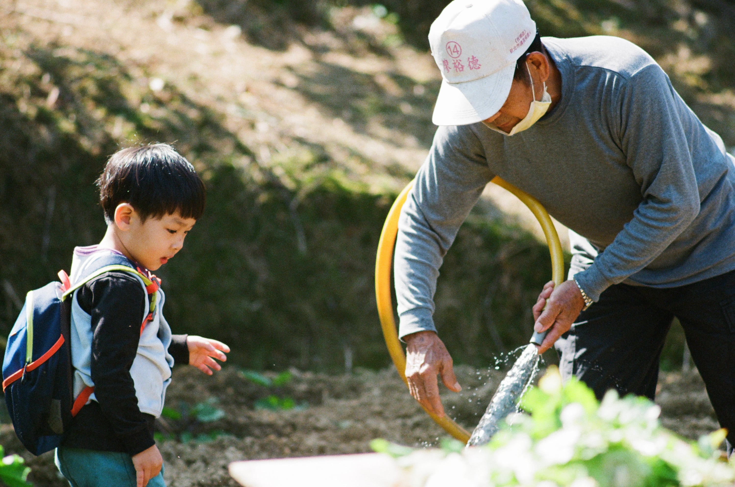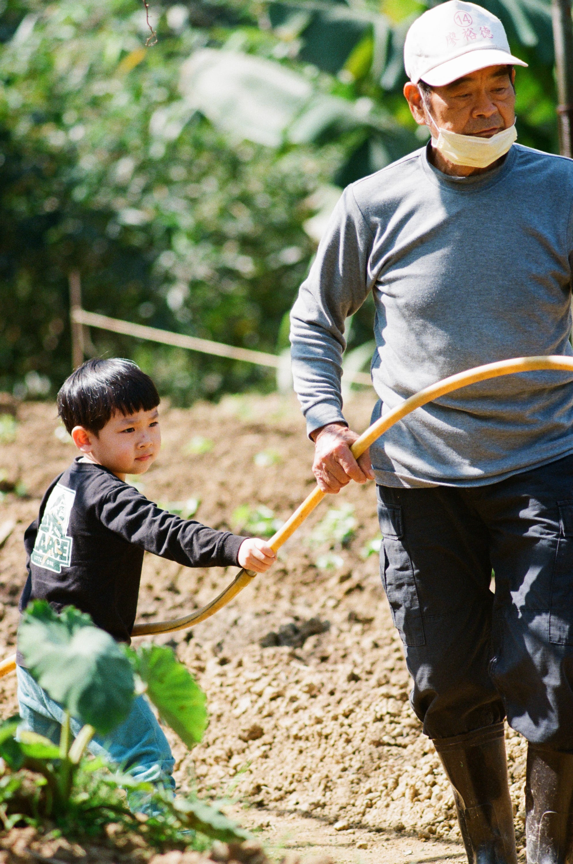 畫面右側是我的姑丈,正在幫菜澆水,而我兒子正在用消防隊的姿勢參與。