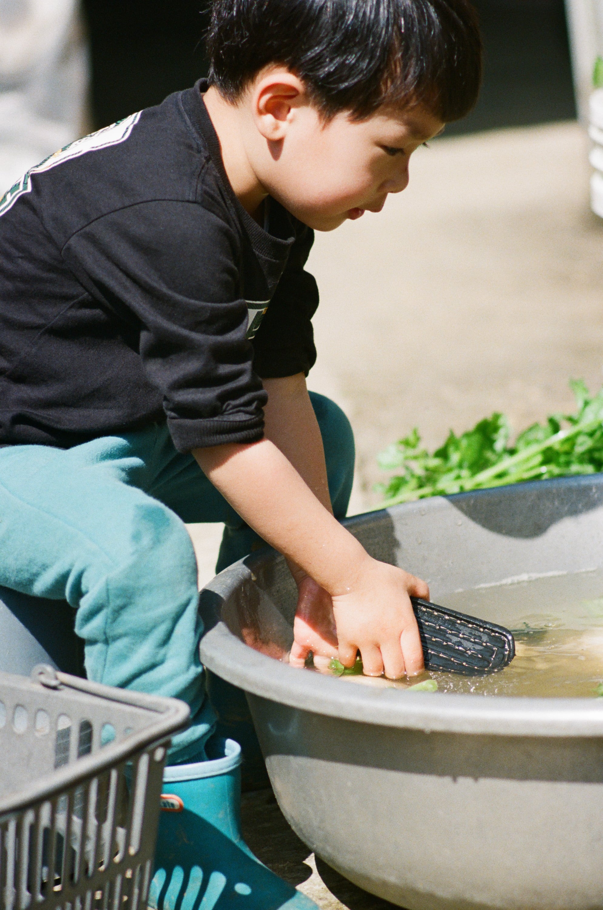 兒子那天拔了一些蘿蔔,正在刷洗泥土中。