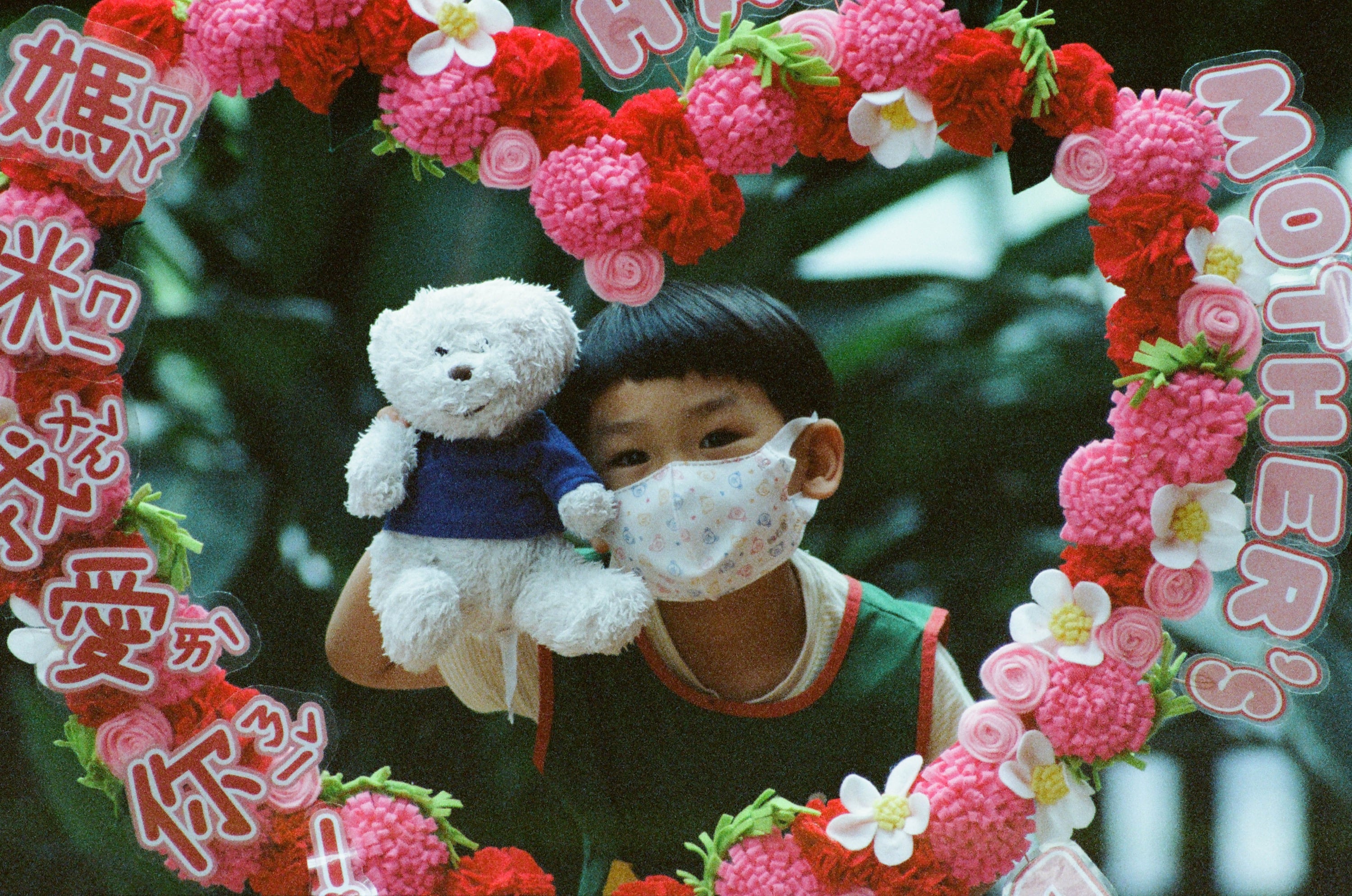 有次背著長焦鏡頭去接兒子下課,剛好碰到那時學校針對母親節所做的佈置,順便拍了一下,兒子手中的熊,是我哥在兒子出生不久後送給他的,結果一試成主顧。