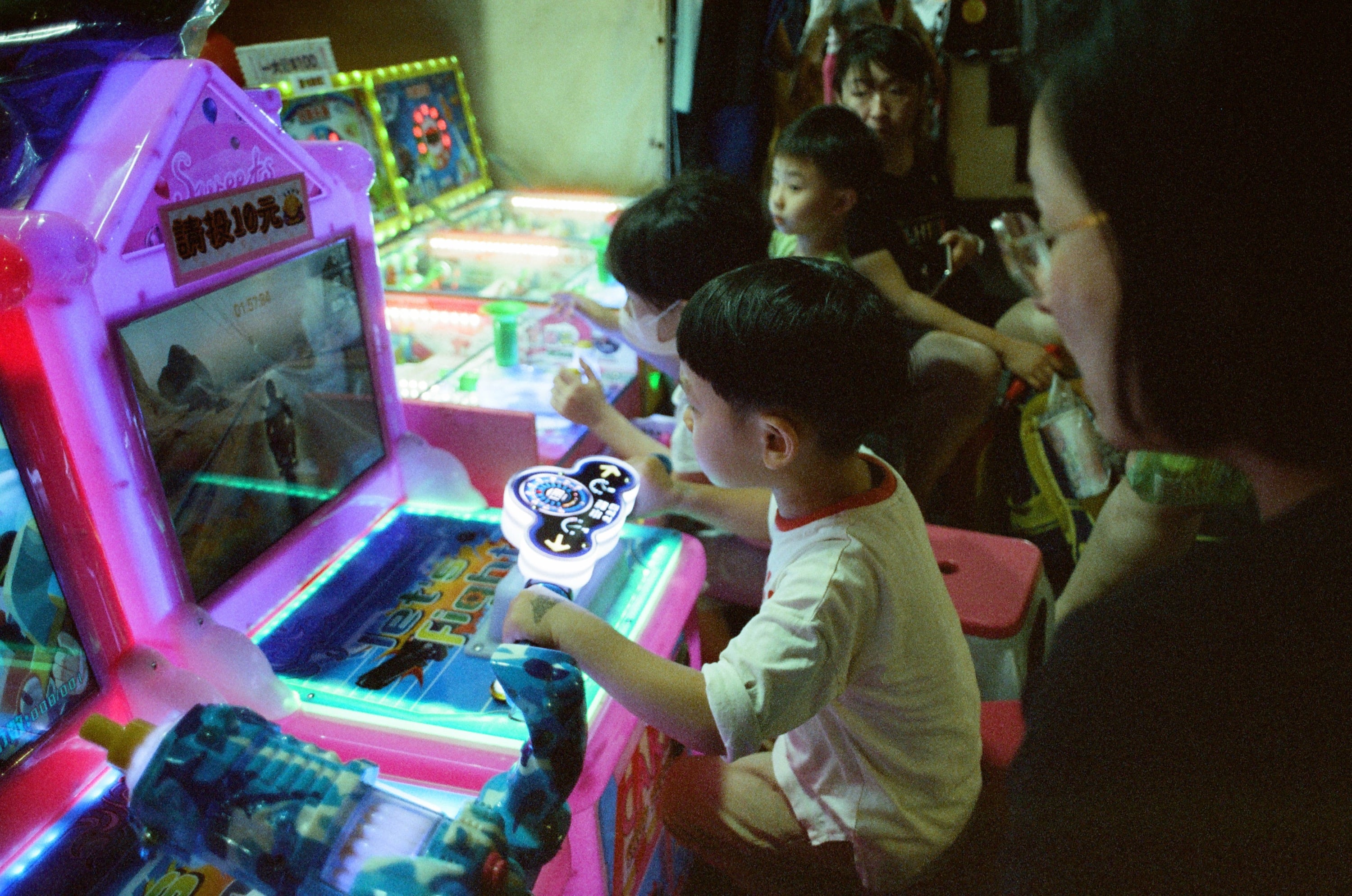 某天下課帶兒子去板橋湳雅夜市打電動,這家電動玩一次才 10 元,超便宜,不用換代幣非常方便。
