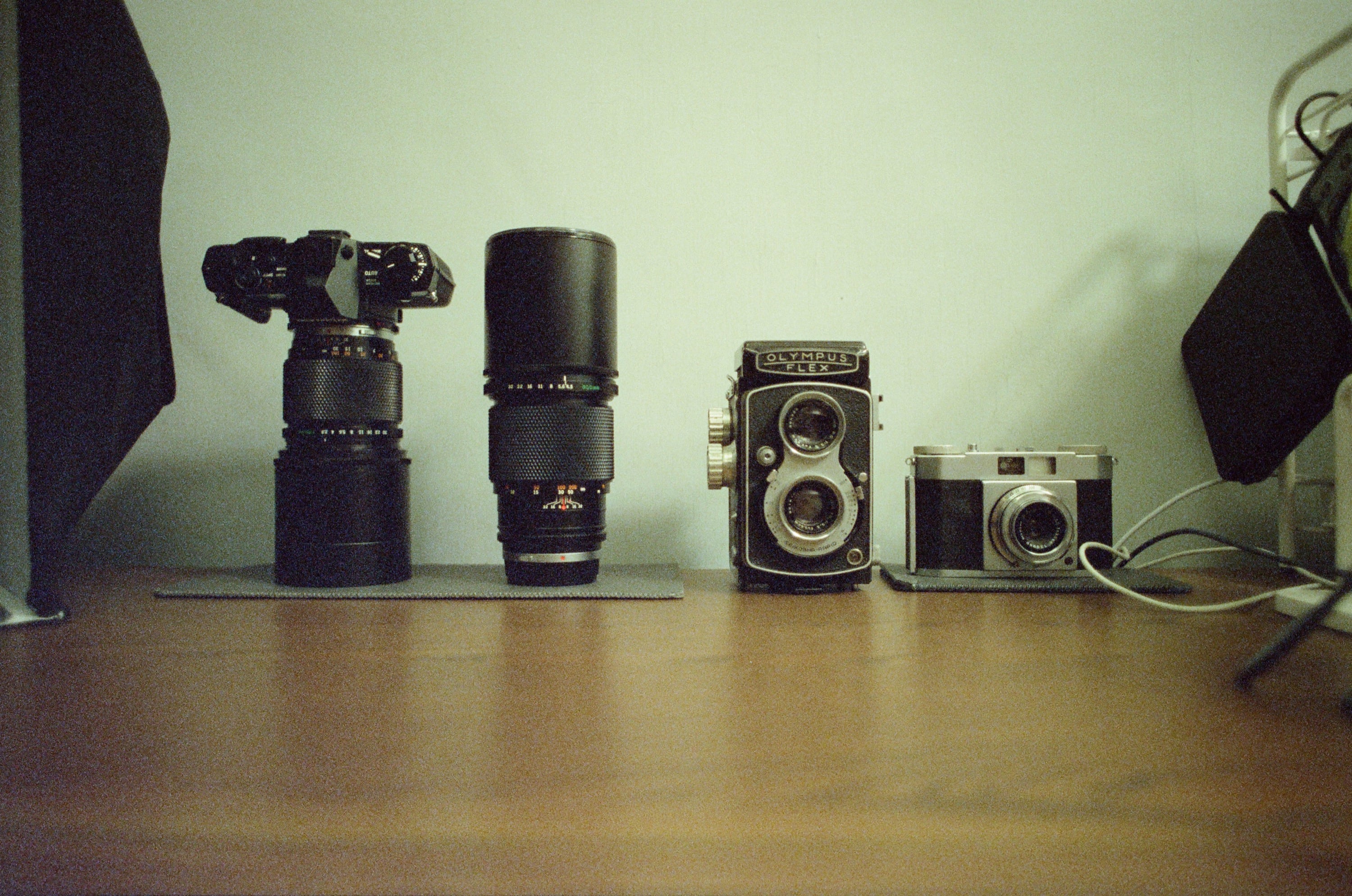我的一些 Olympus 相機們,從左至右是 Olympus OM-4 和 Olympus OM 180m f2.8 鏡頭,Olympus OM 300mm f4.5 鏡頭,Olympus Flex A 3.5 雙眼相機,Olympus Wide 35mm f3.5 估焦相機。