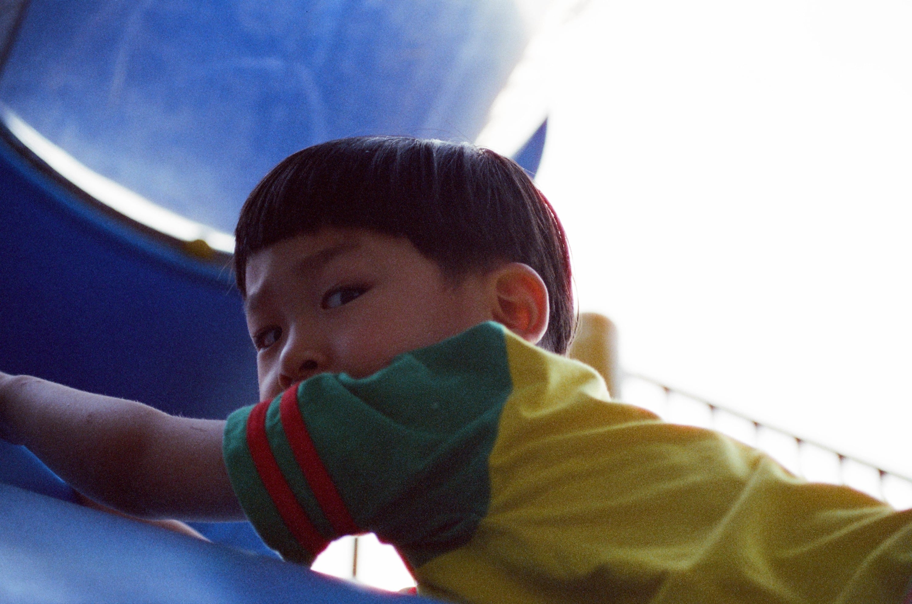對於受困遊戲裝置高處的兒子回頭看我,用眼神透露出為什麼這位爸爸只顧著拍照,而不願意救他呢?
