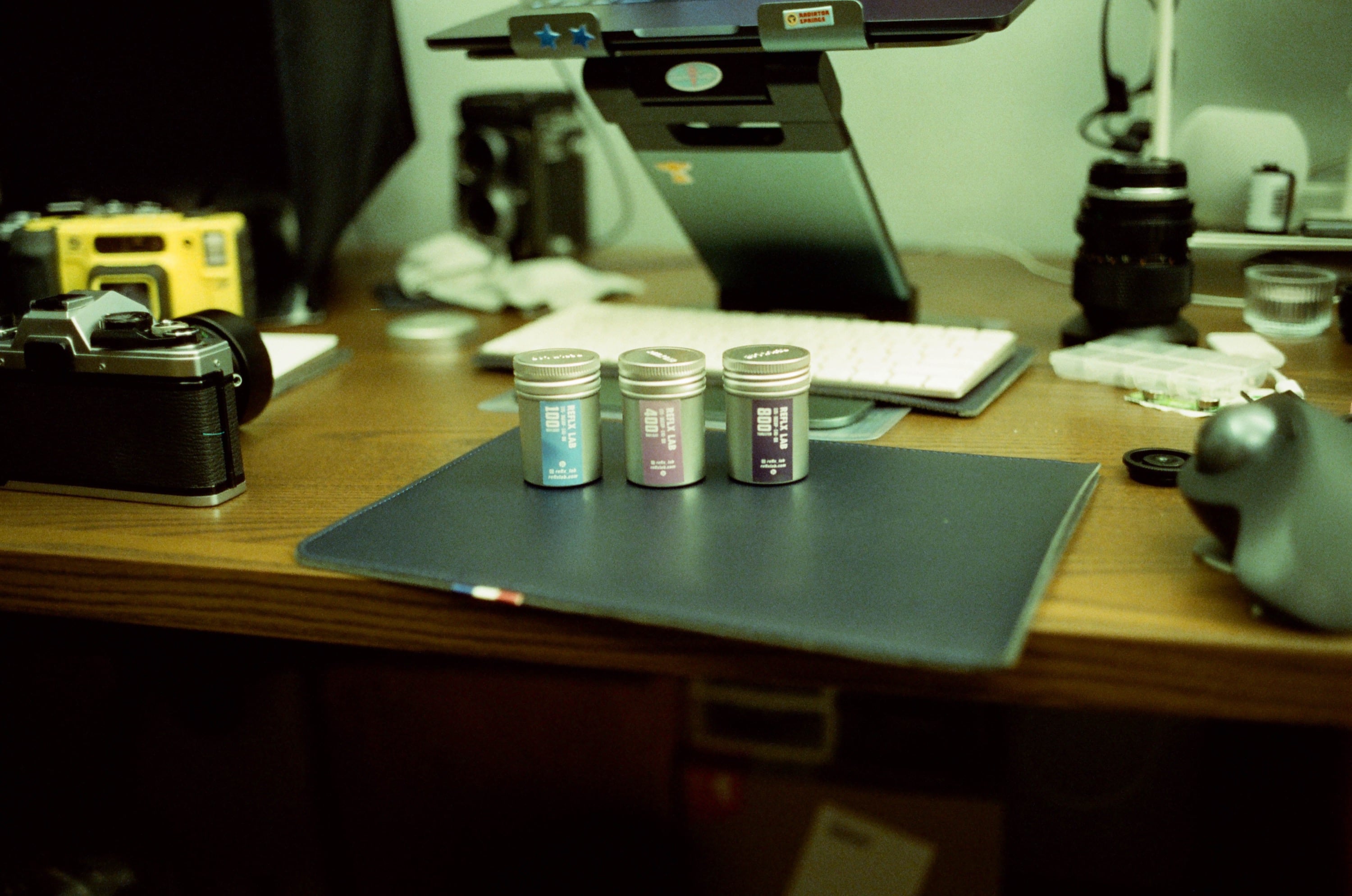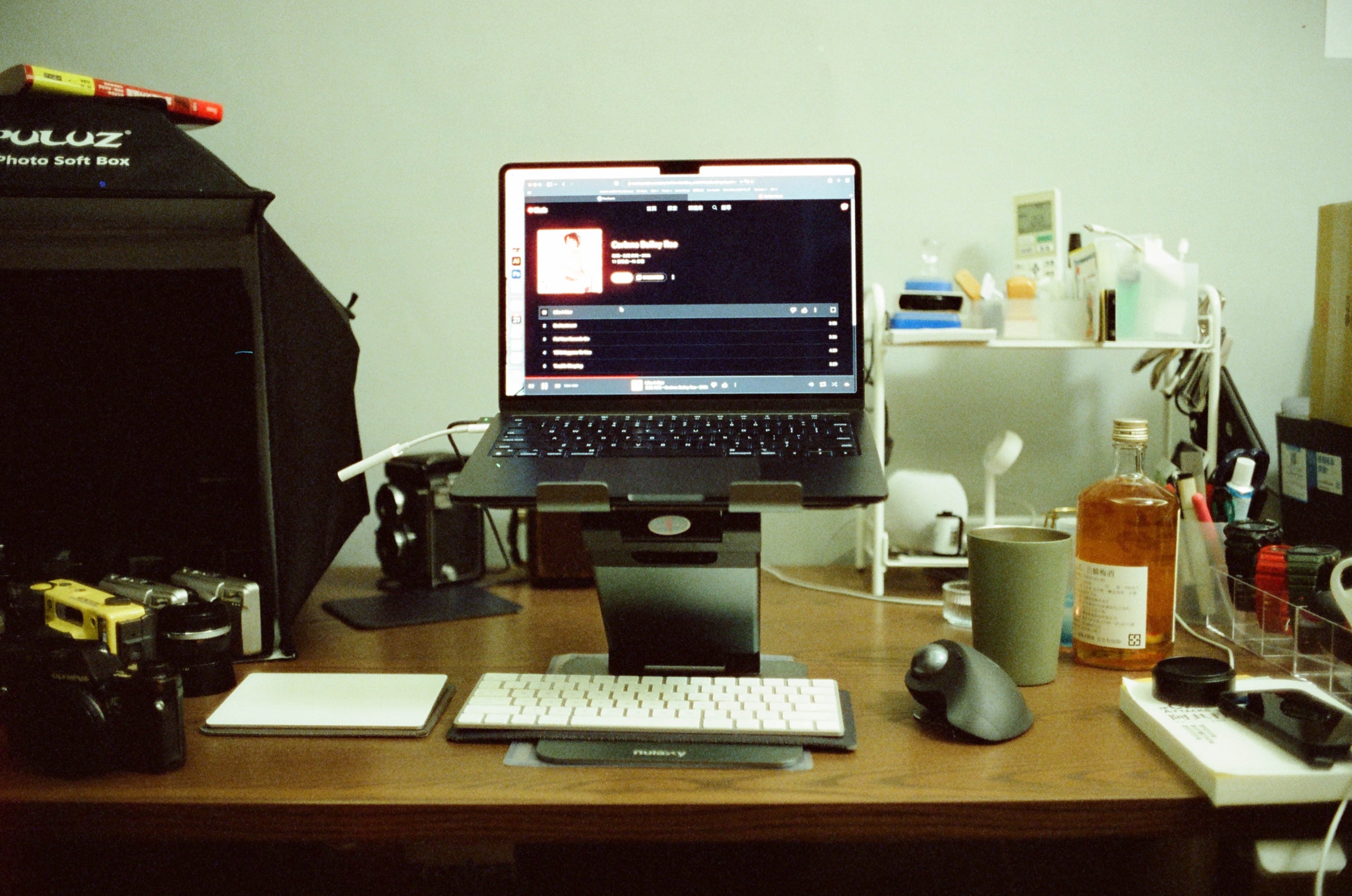 測試一下手動模式,這一張是這卷底片唯一的手動模式照片。圖為我那時的工作桌樣貌,畫面左邊是新買的傻瓜相機們,右邊是最近在喝的酒(Costco 白鶴梅酒),然後中間是正在放著 Corinne Bailey Rae 音樂的筆電,其實我還滿喜歡用筆電聽薄薄的音樂的,覺得這種頻率聽起來很舒服。