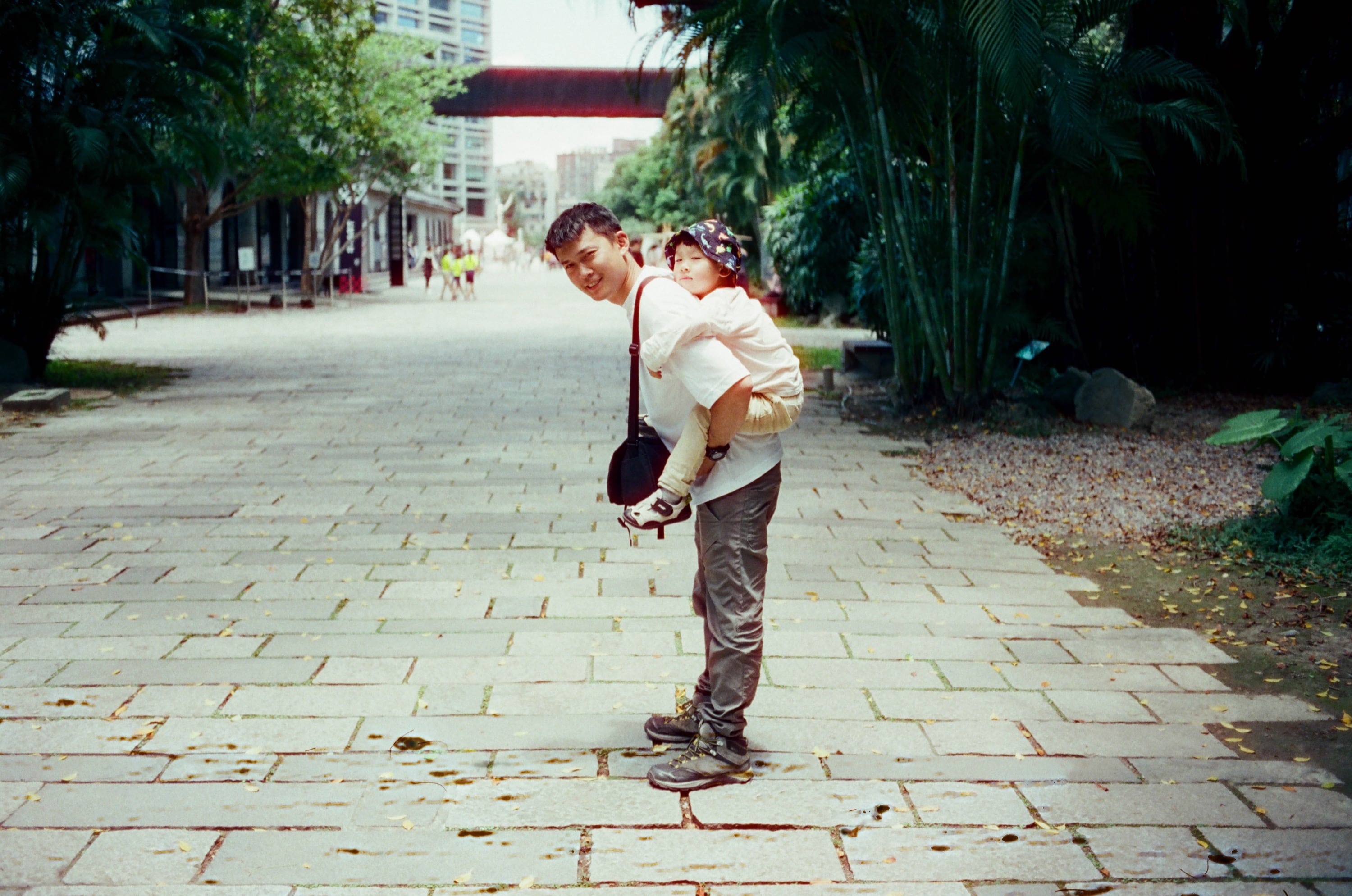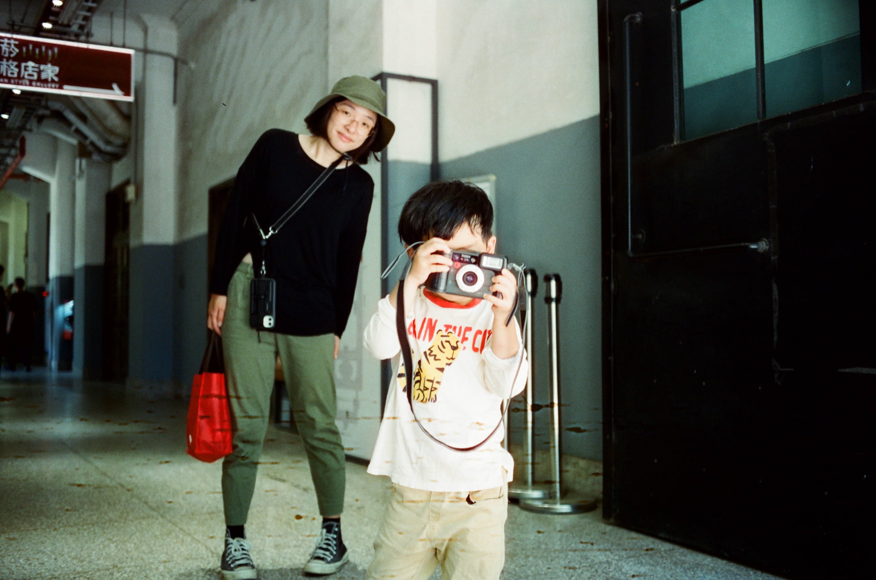 和家人在松菸,圖為背著 iPhone 11 還在堅持不換手機的強者我太太,還有背著 Konica 現場監督 28HG 的兒子。這張照片上面有著品質不佳的分裝片痕跡。