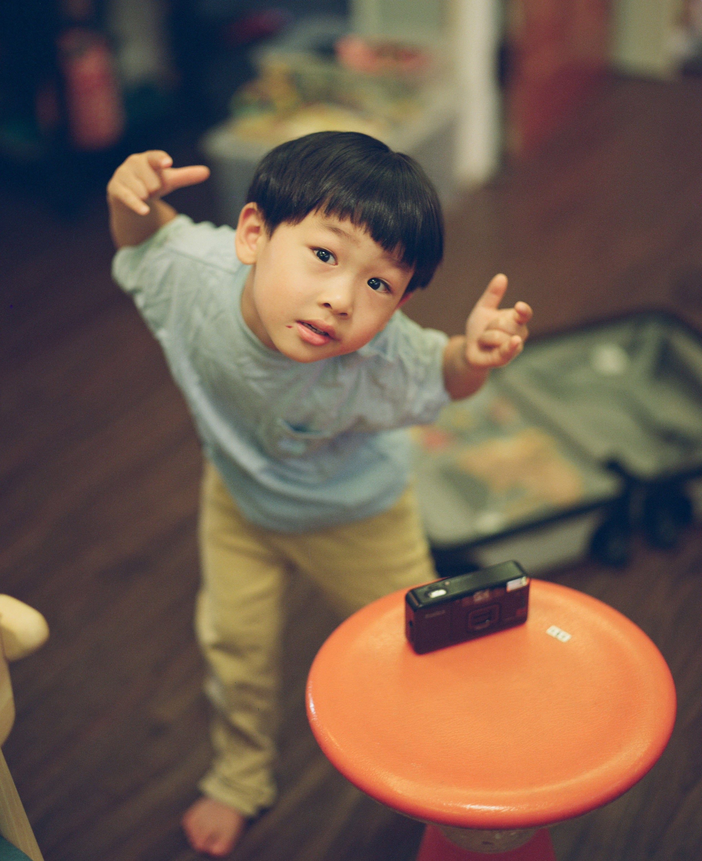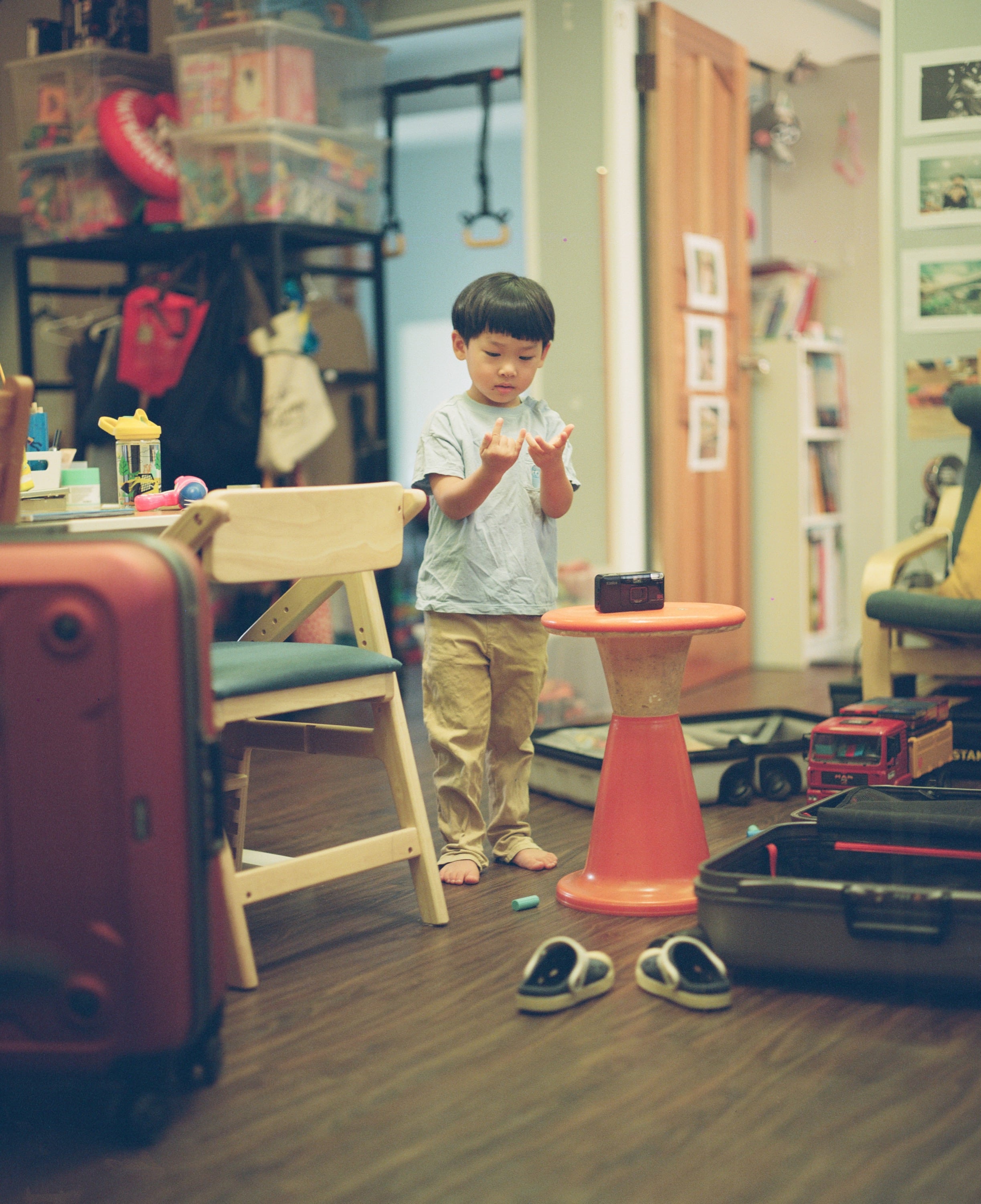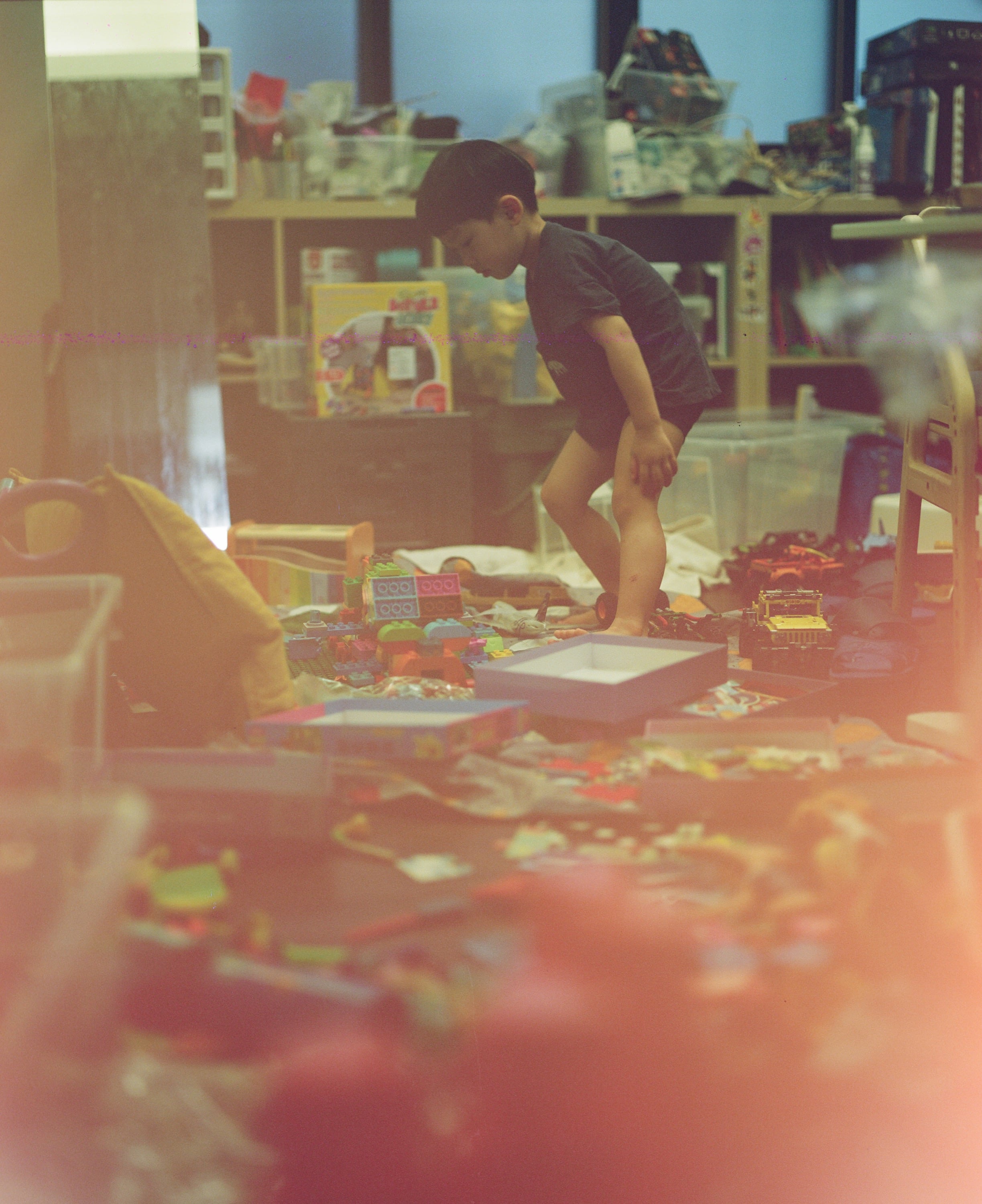 這是這卷底片中我最喜歡的一張照片,兒子在如同廢墟的玩具堆中行走,紀念某天這位父親在家帶小孩時的一個日常場景。只可惜這張照片漏光了,因為當初這卷底片是從一台壞到的機身中取下的,在取下重裝的過程中有不慎吸收到外面的光線。
