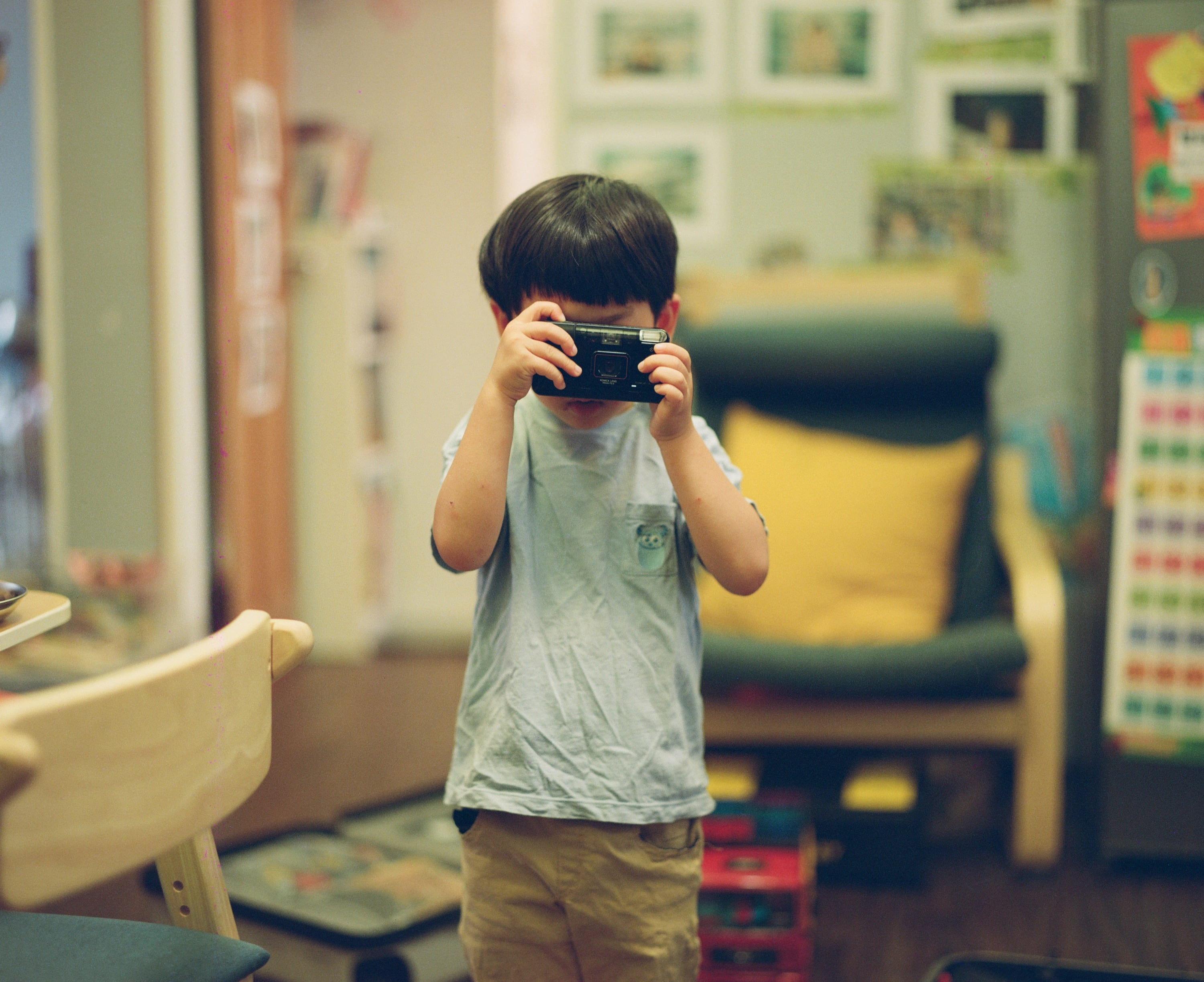 拿著 Konica Big Mini A4 拍照的兒子,但裡頭我沒裝底片,兒子說比起 Konica 現場監督,他比較喜歡 Big Mini,因為比較小台,比較好拿。