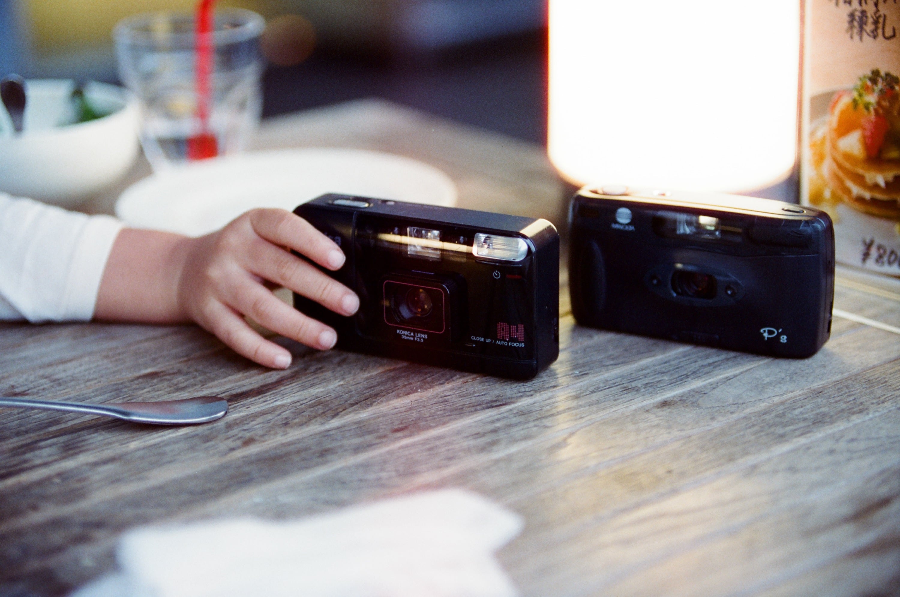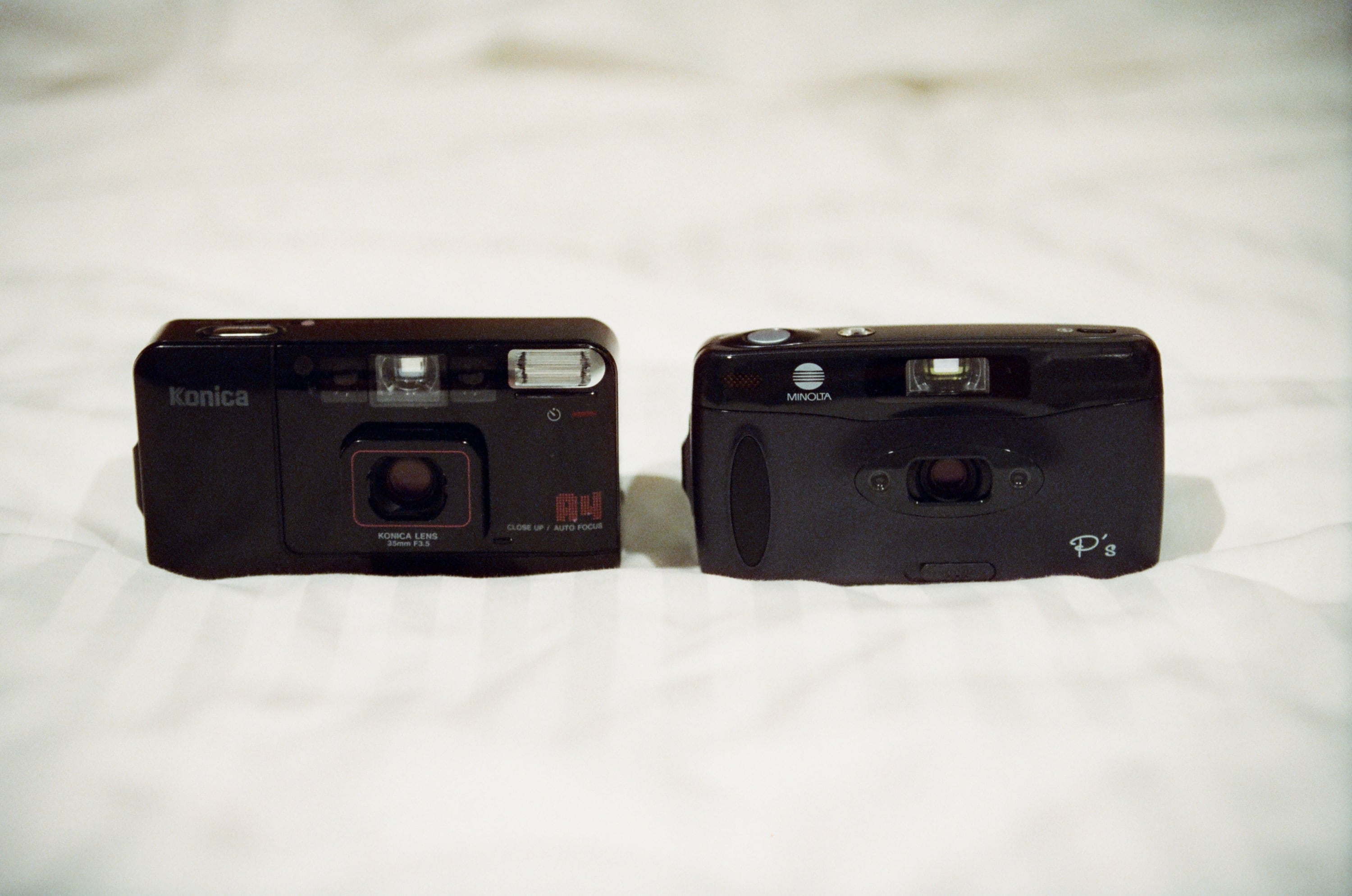 兩位傻瓜相機代表,左邊那台是閃光燈故障的 Konica Big Mini A4(35mm f3.5),萬中選一才有的規格;右邊那台則是 Minolta P's 純寬景相機(24mm f4.5),因為閃光燈沒壞,因此被我用攝影膠帶給貼了起來。