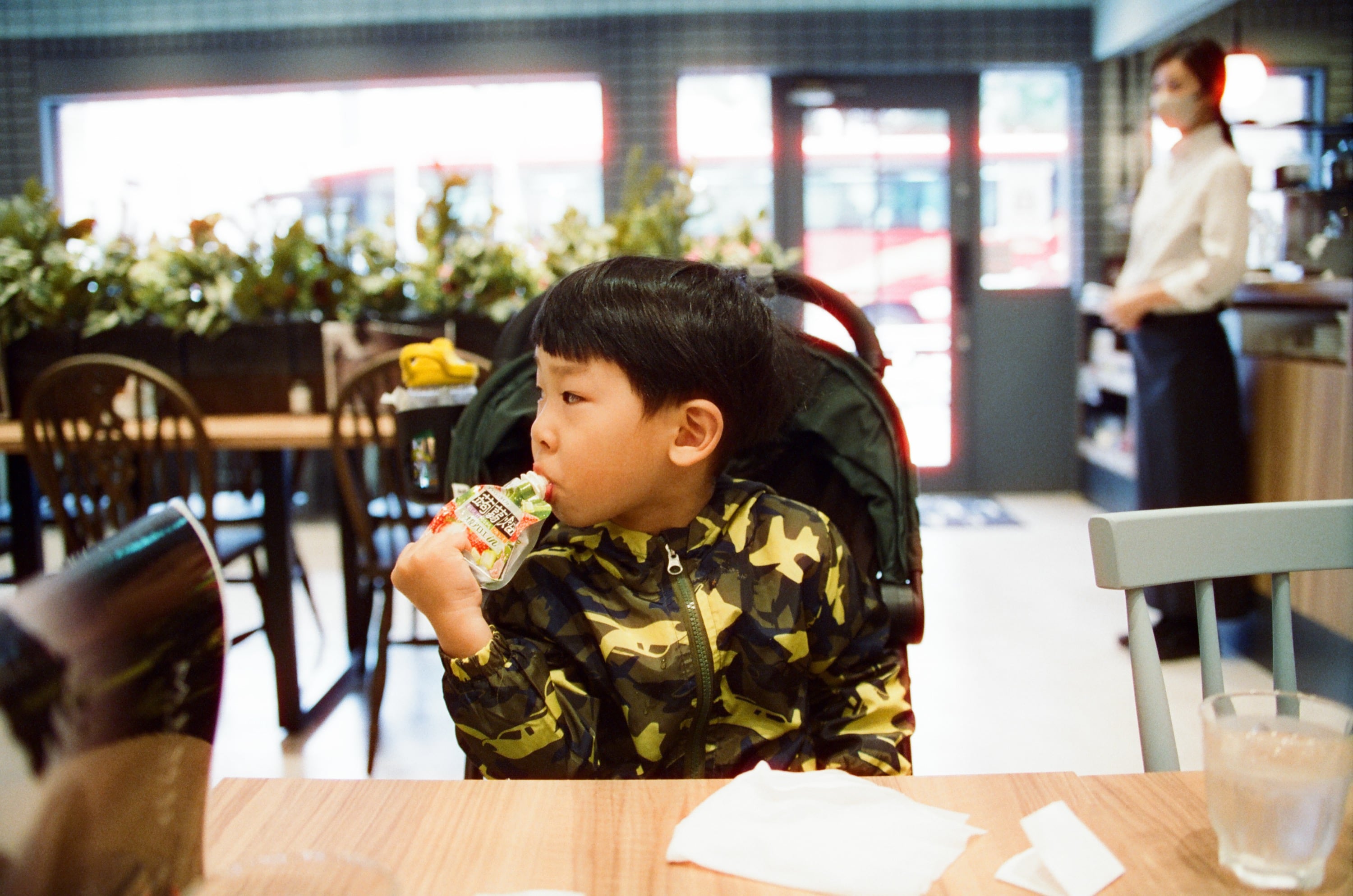 第三天的早晨,我們走進一間路上經過看起來還不錯的咖啡廳。又是一間在日本當地 Google 評價沒有四顆星,但若搬來台灣肯定會有 4.5 顆星水準的好店,日本人對於美食真的很嚴苛。圖為在日本狂吃果凍的兒子。