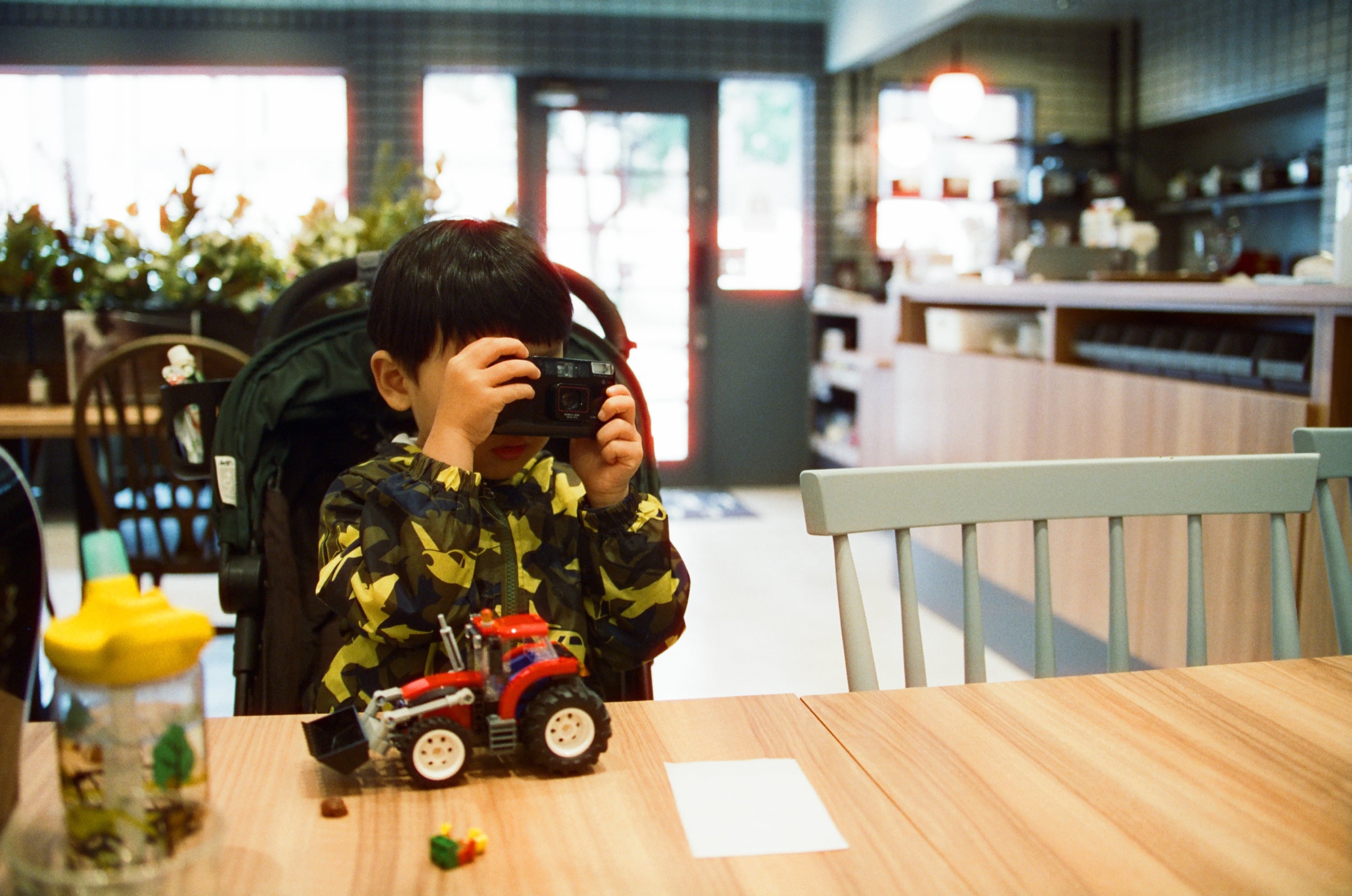 正在使用 Konica Big Mini A4 拍照的兒子,桌上擺的是我們昨天去樂高樂園買的戰利品。