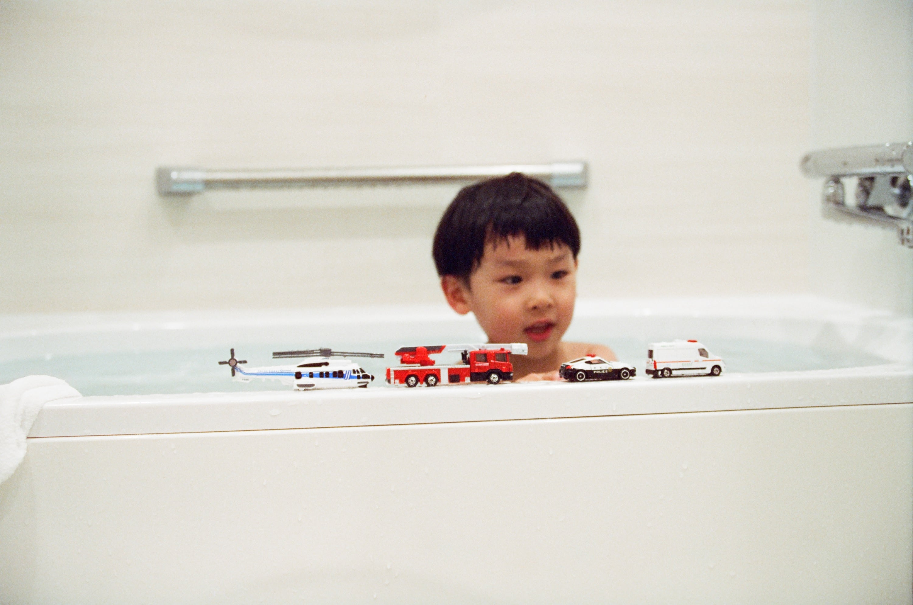 今日我們有逛到一間整棟都是賣模型的店,圖為兒子的 Tomica 戰利品們,邊洗澡邊玩。日本的衛浴真的很讚,浴缸泡澡很舒服。