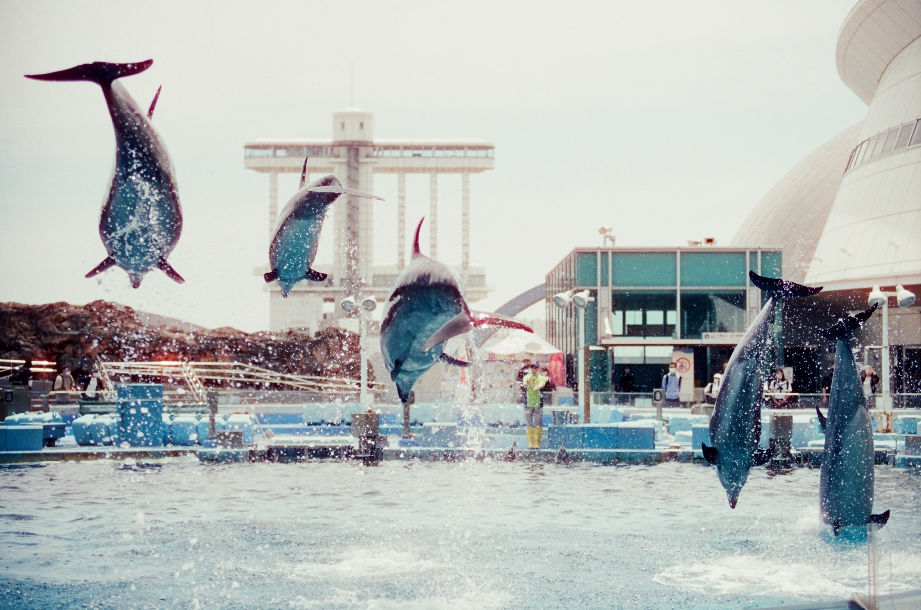 名古屋水族館的飼育員訓練,可以讓五隻海豚同時躍出水面,真的超神的,不知道背後練習了多久。