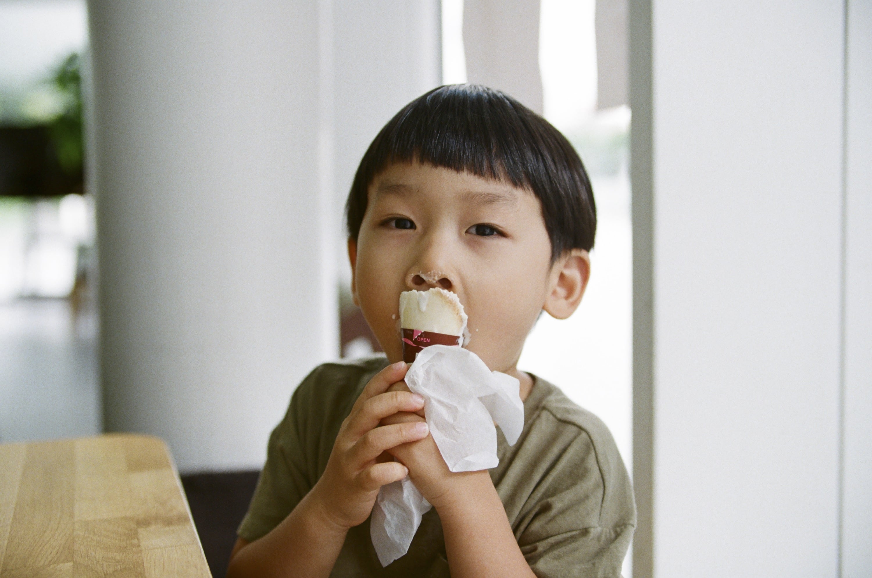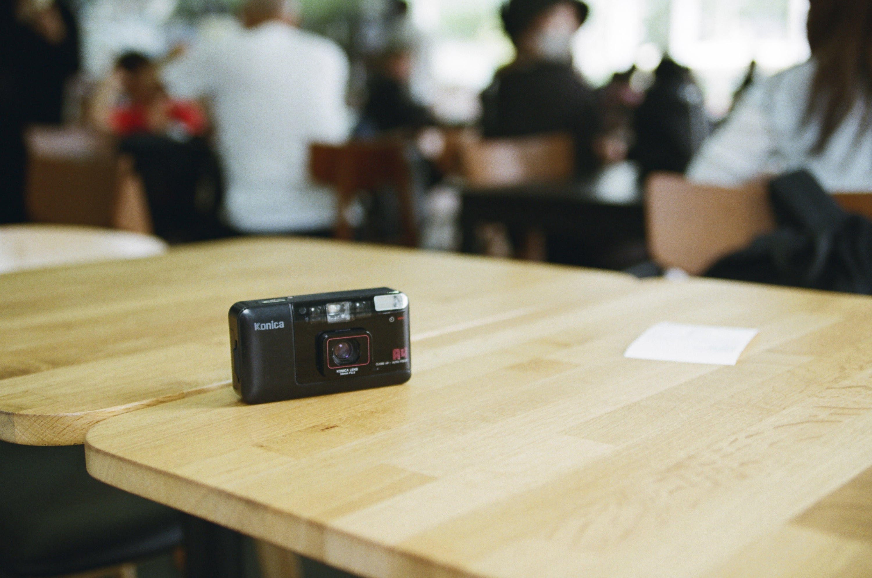 正在休息吃冰淇淋的我們,圖為本次日本行的隨身機擔當,Konica Big Mini A4 無閃光燈版(閃光燈故障的意思)。
