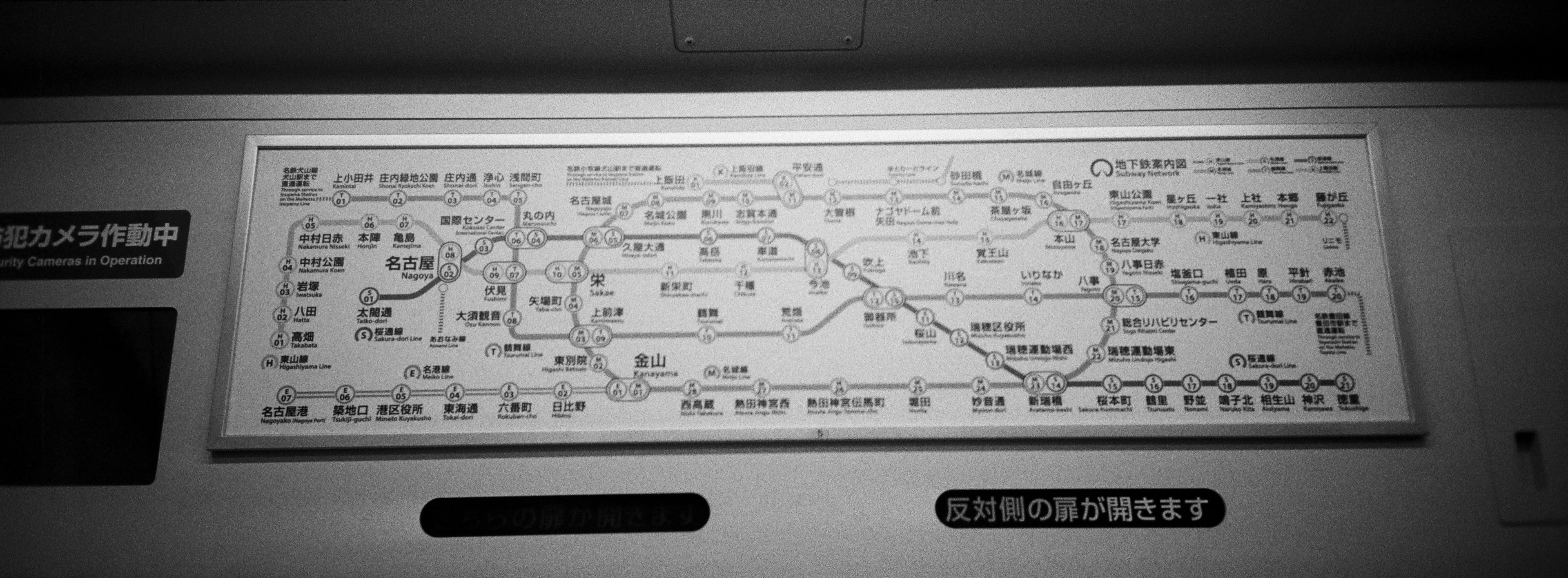 已經到名古屋了,我們正搭乘從名古屋中部國際機場開往名古屋市區的電車。你可以看到,當光線非常充足的時候,右下角日期標記的字體粗細會不太一樣。一般來說,用手機 App 就可以幫照片加上日期標,不過真正的底片,日期標的外觀會隨著光線具有不同的變化,就跟你說底片真的很難用數位模擬了吧!