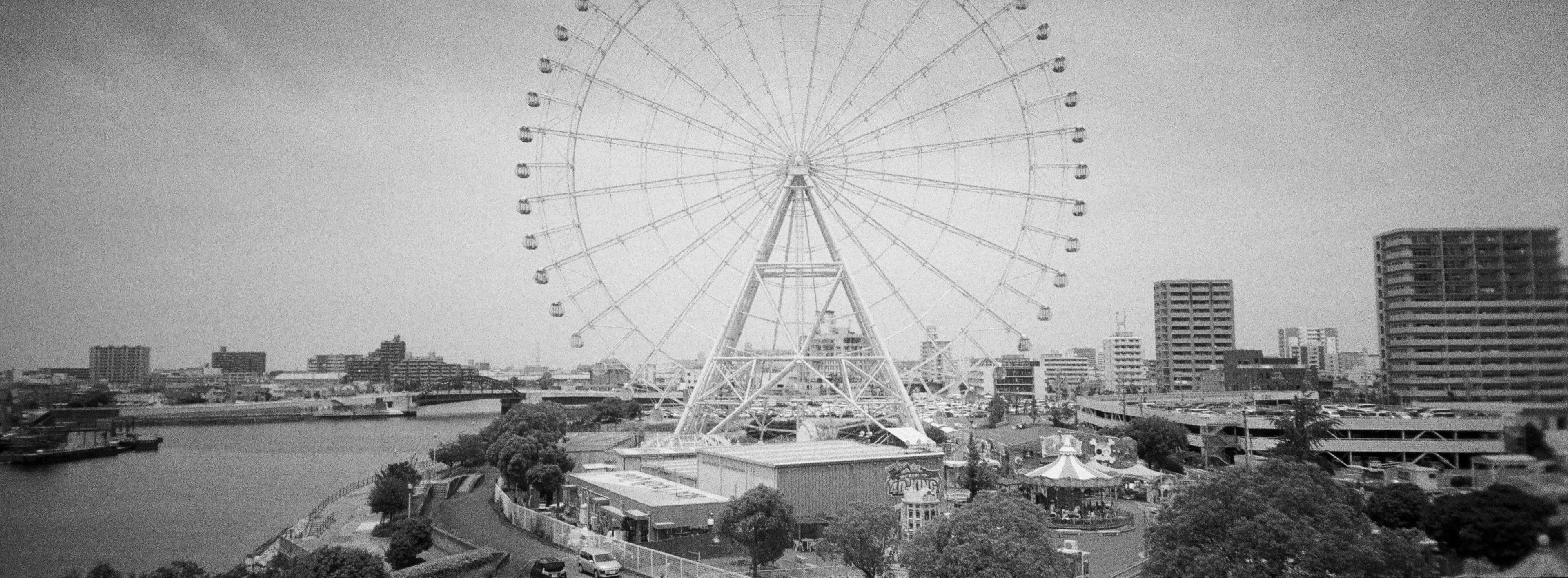 名古屋水族館旁邊的遊樂園摩天輪。我因為在日本名古屋之旅是三機出動(Olympus OM-3 Ti、Konica Big Mini A4 和 Minolta P's),因此有些畫面我是三台相機各拍一張,因為我想要比較一下不同相機拍出來的感覺。