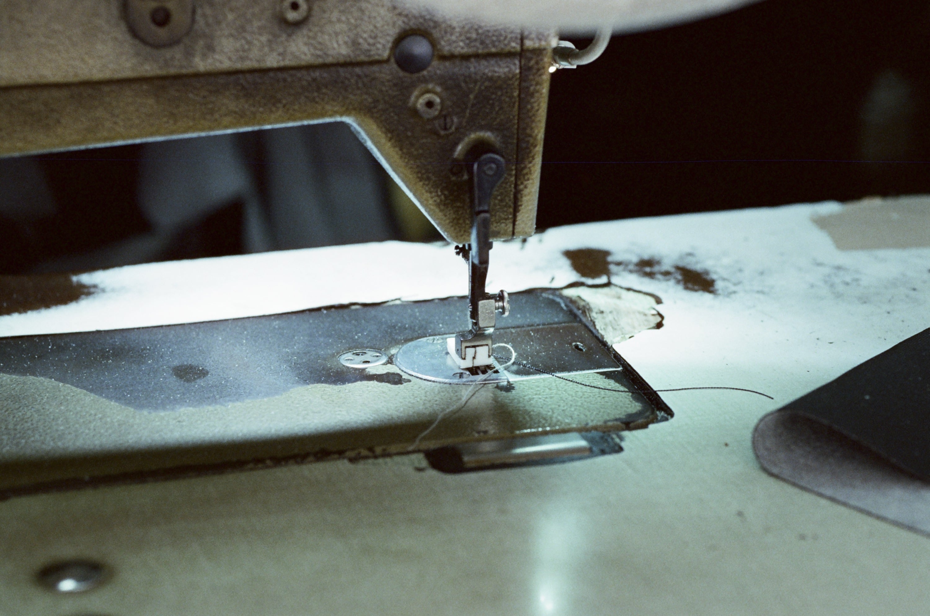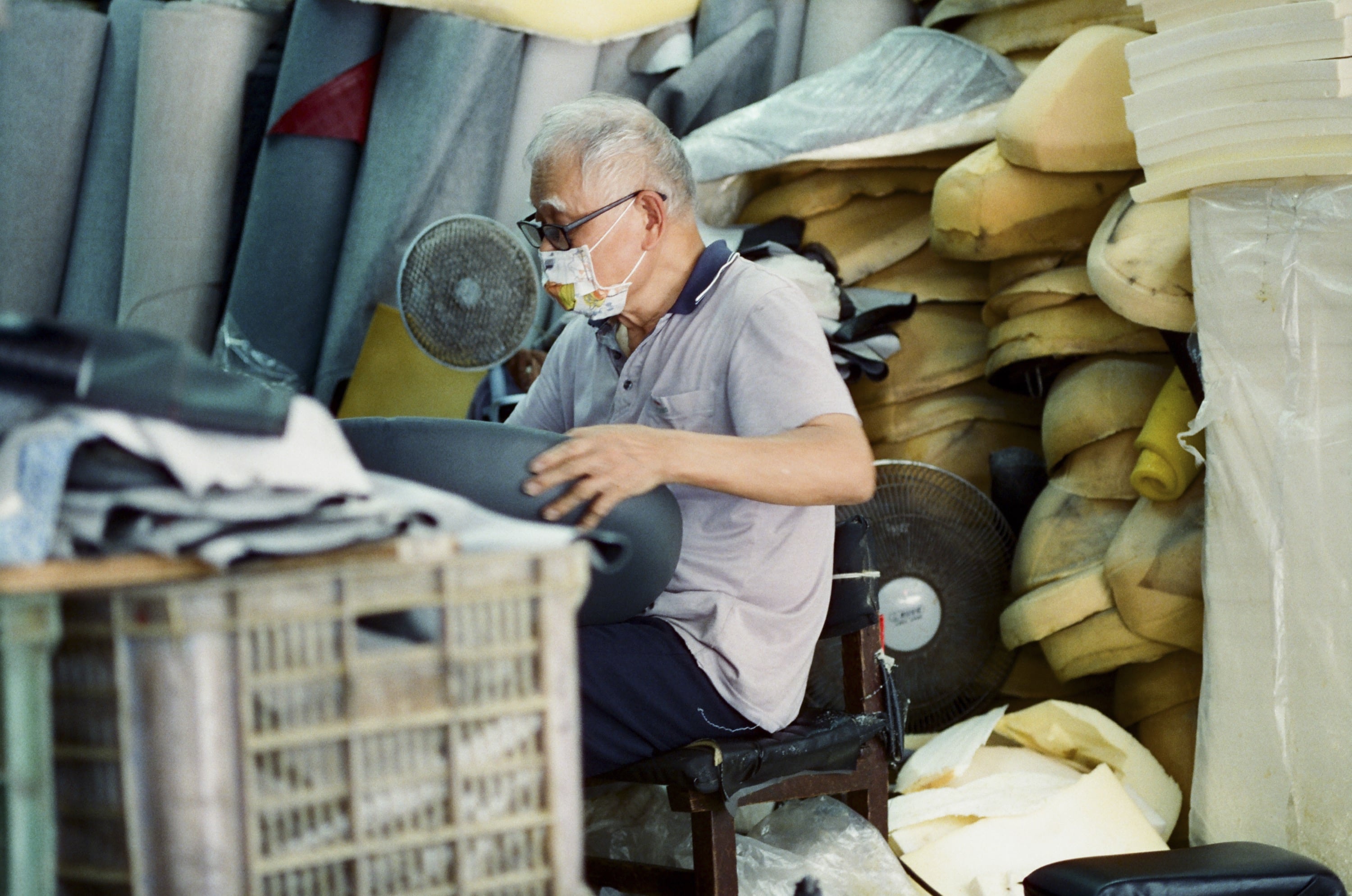老闆正埋首於眾多座墊中,手起刀落、手起刀落。