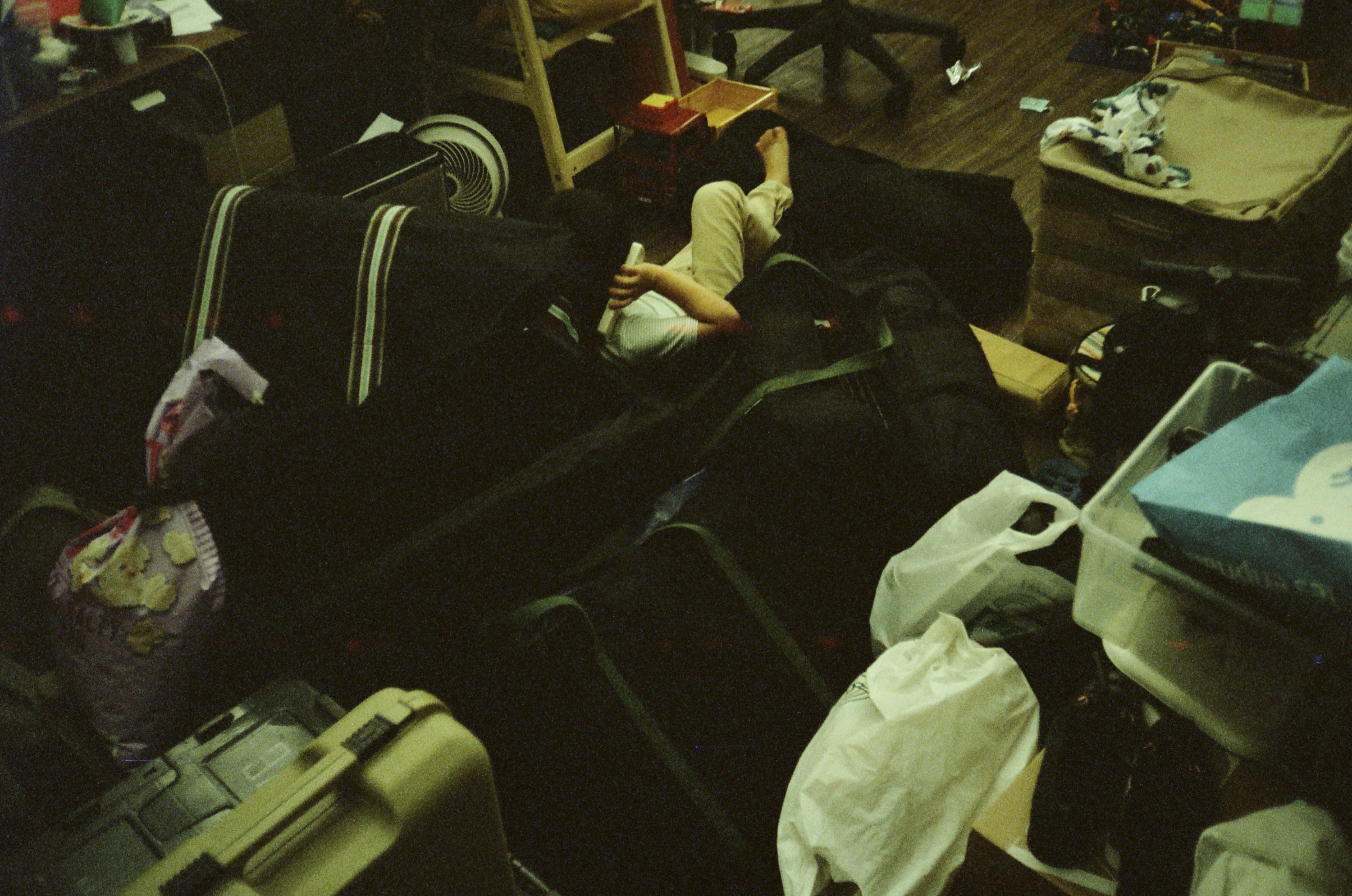 露營完,被淹沒在裝備堆中的四歲小孩。他很愜意地躺在裝備包上面講電話。