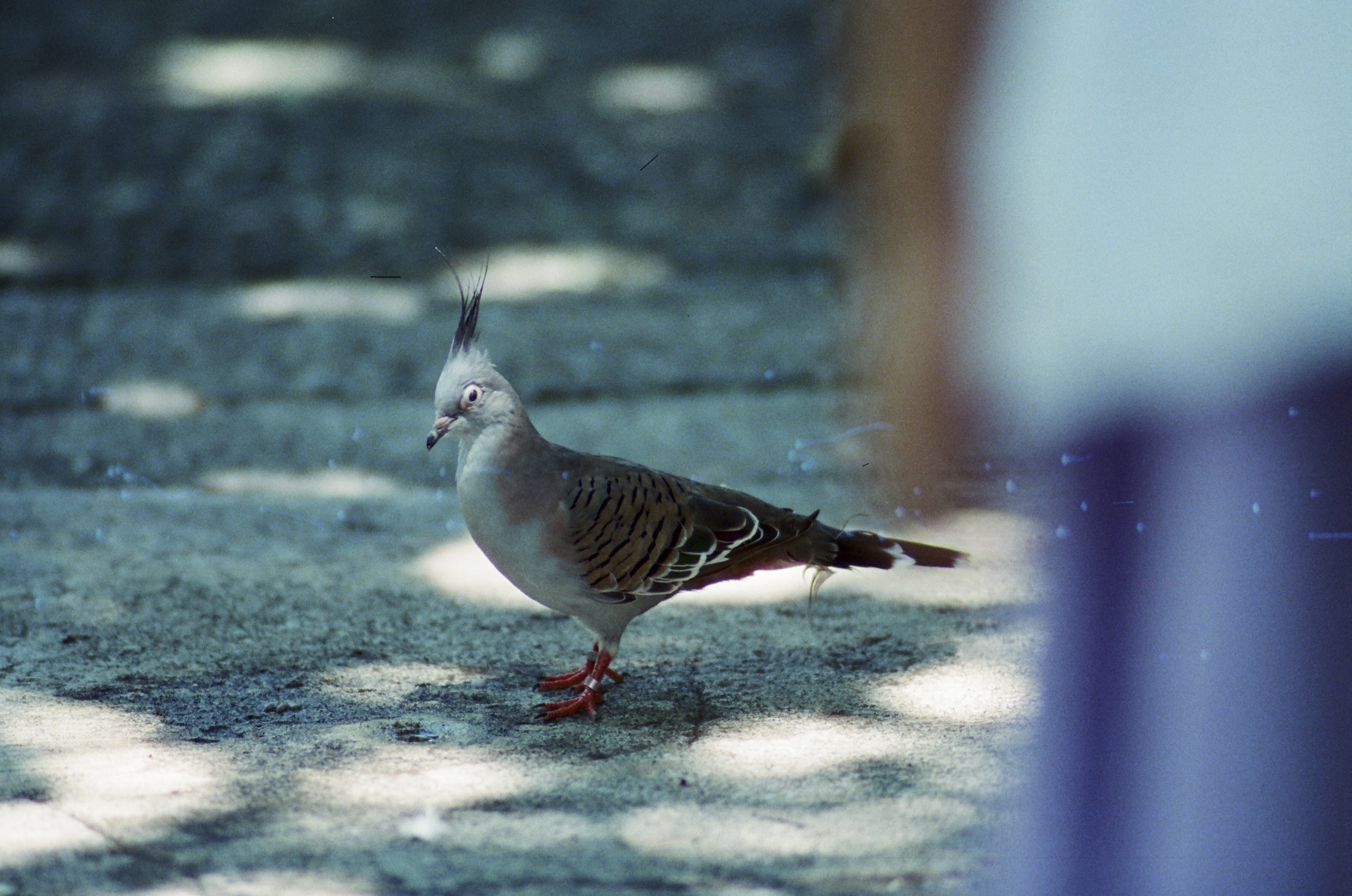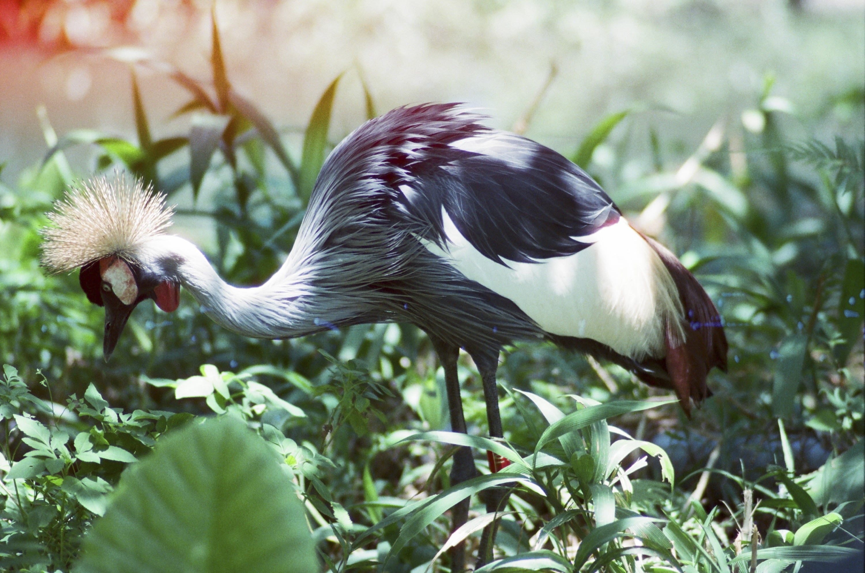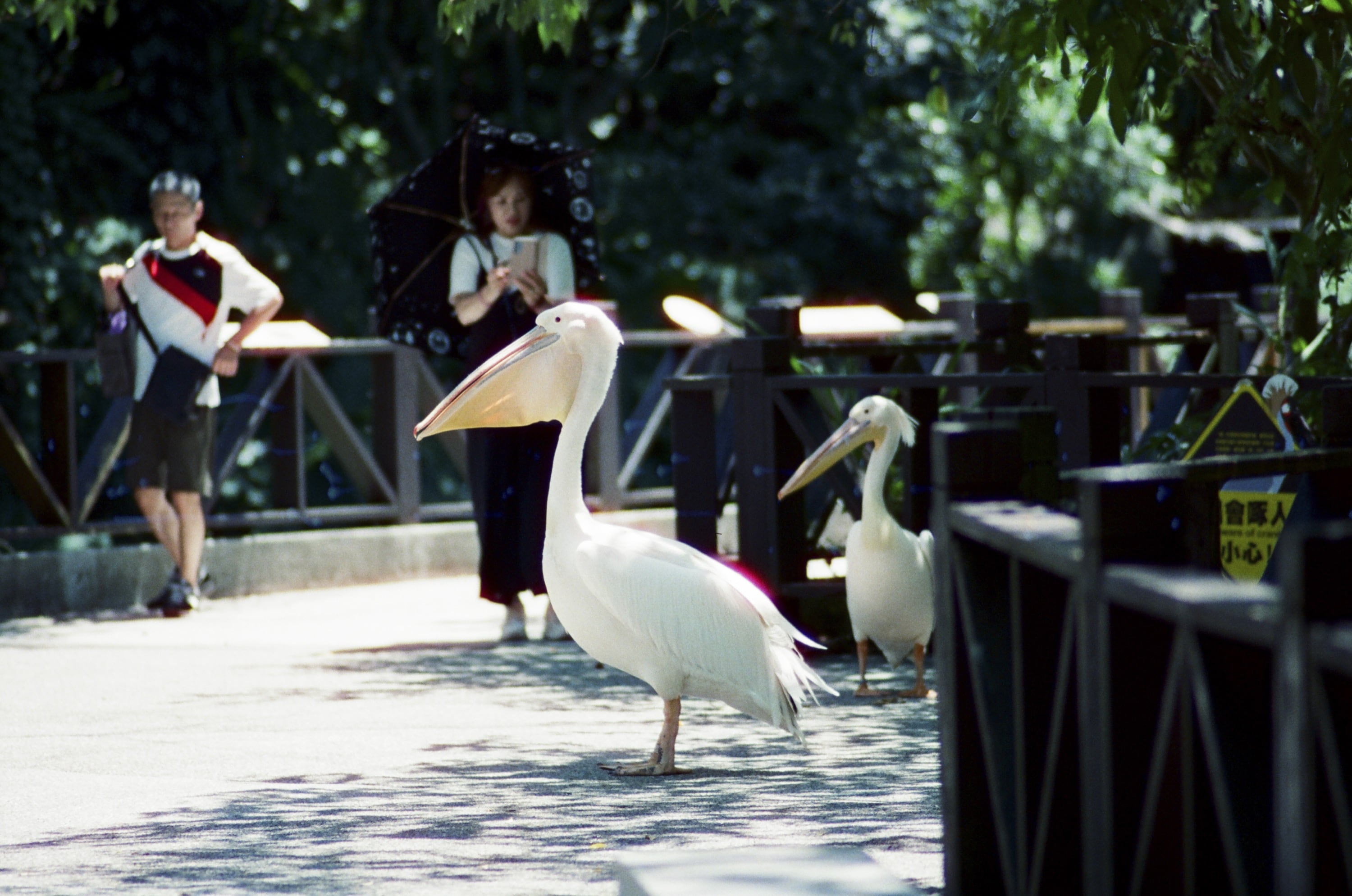 時間來到動物園,此時我們身在鳥園,因為我是想測試看看 Olympus OM 180mm f2.8 這顆鏡頭,因此就都拍鳥看看。圖為綠簑鳩(又稱綠蓑鴿),牠們的頸部簑羽真的很有特色,不過這卷底片真的太糟糕了,暗部細節完全消失,跟第一張那個片頭溫度計看不清楚一樣。