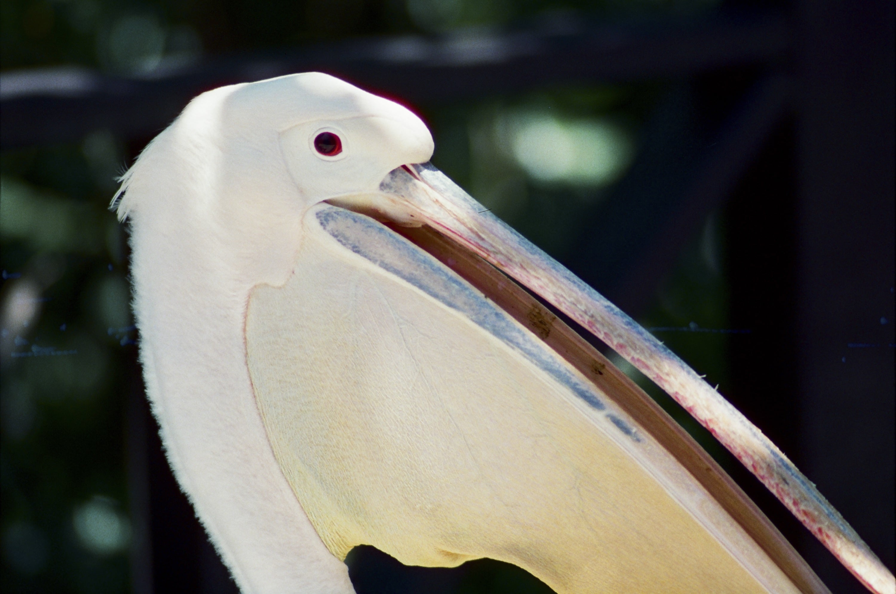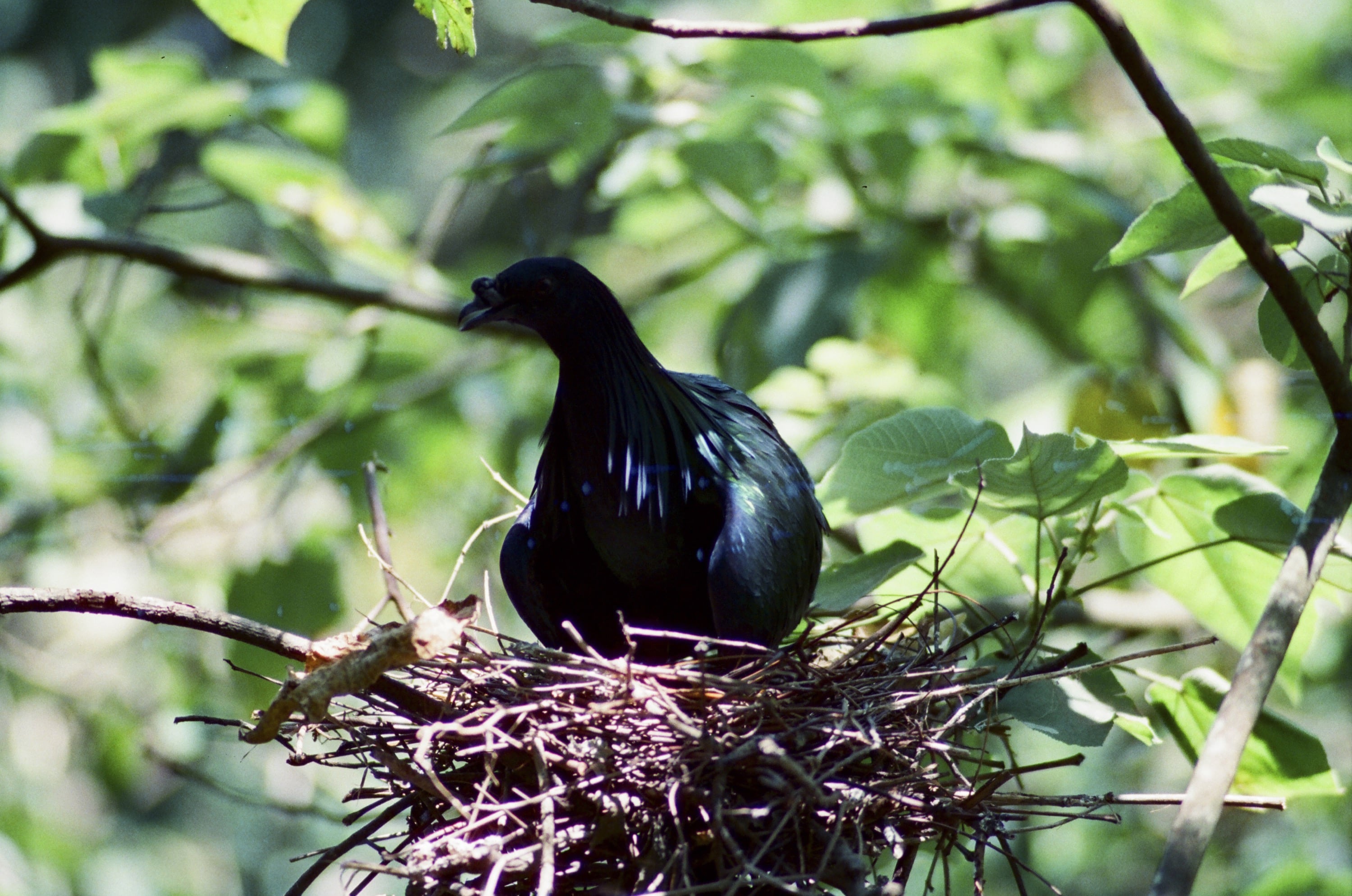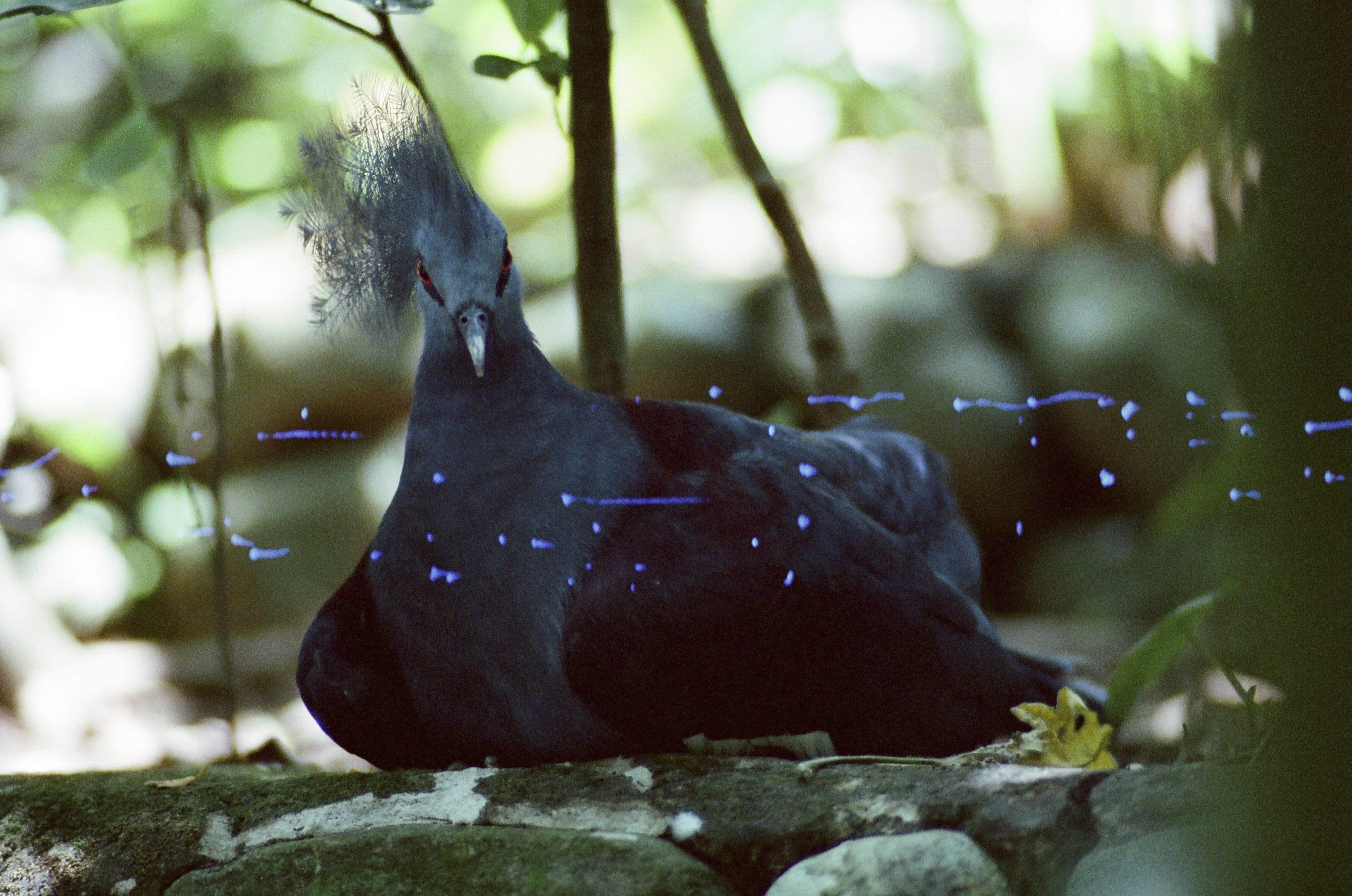 時間來到動物園,此時我們身在鳥園,因為我是想測試看看 Olympus OM 180mm f2.8 這顆鏡頭,因此就都拍鳥看看。圖為綠簑鳩(又稱綠蓑鴿),牠們的頸部簑羽真的很有特色,不過這卷底片真的太糟糕了,暗部細節完全消失,跟第一張那個片頭溫度計看不清楚一樣。