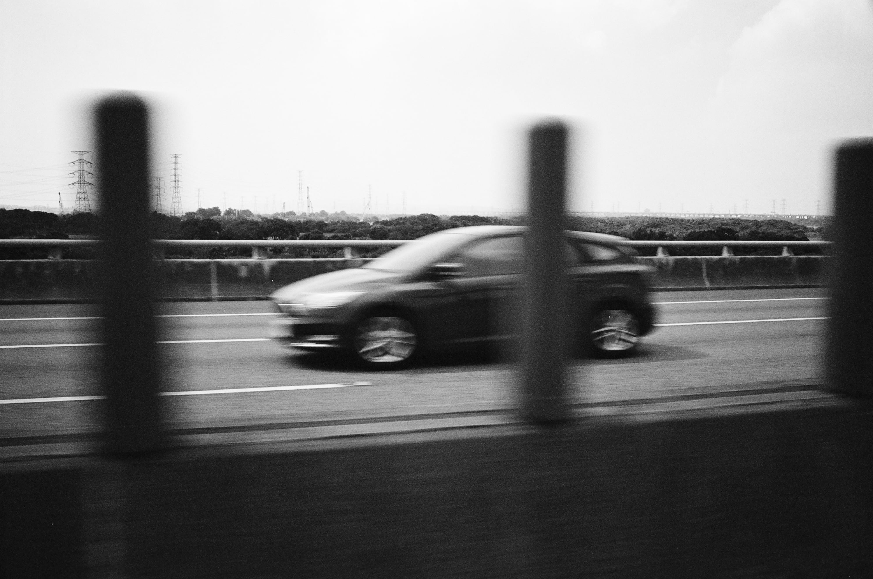 要單手開車還要單手拍照,要保持平衡,通常不太可能。這張照片原本下意識在進 Lightroom 之後想要做水平校正,但水平一拉正之後,速度感就消失了不少,結果最後還是選擇不調整。歪斜的就讓它歪斜吧,這才是真實的速度。