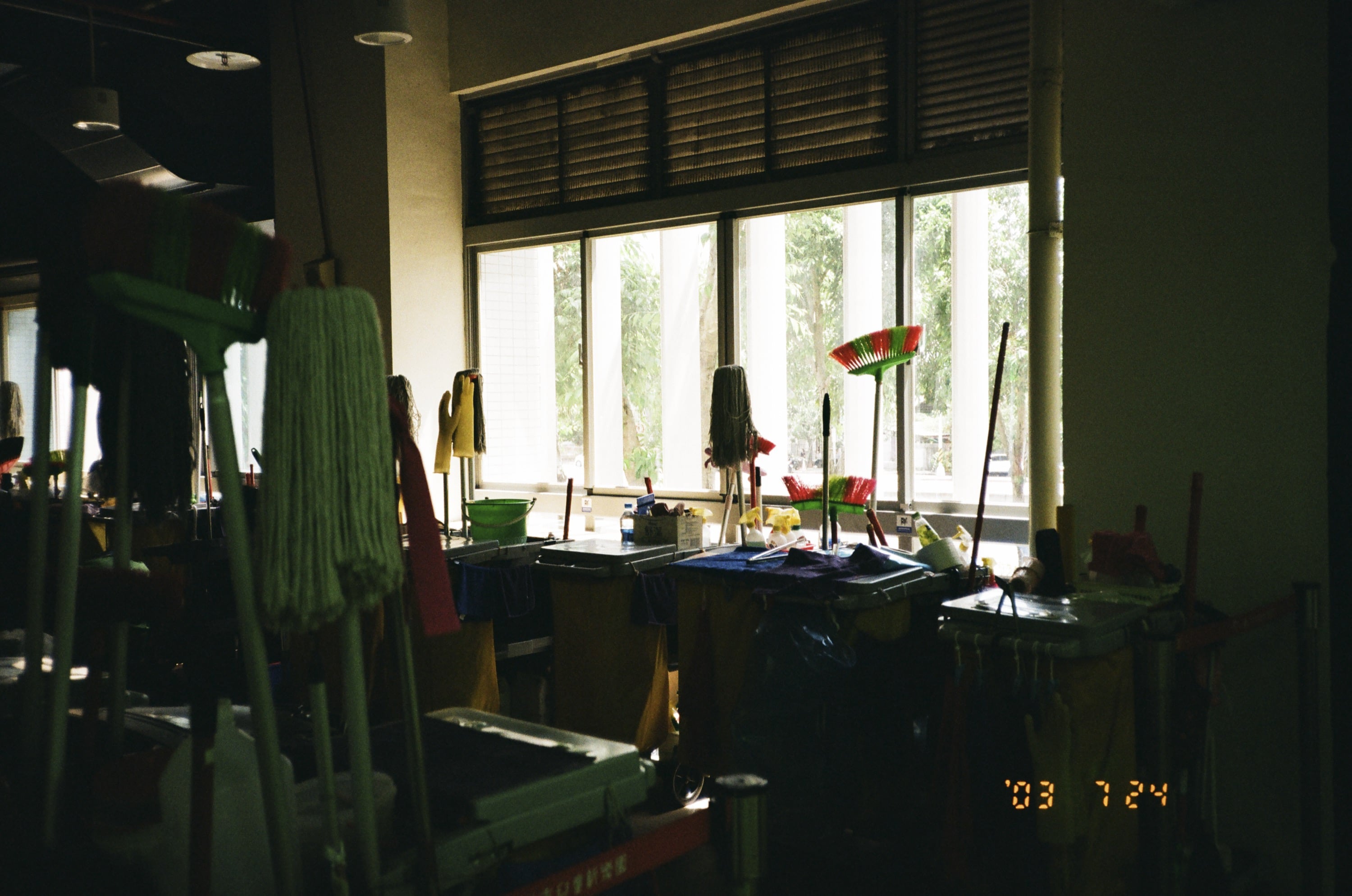 正當我們在兒童樂園吃冰時,這時候萬安演習警報聲響起,我們全部人都被要求到室內進行躲避。圖為一個清潔人員的休息室,我們不是躲來這邊,只是剛好經過。