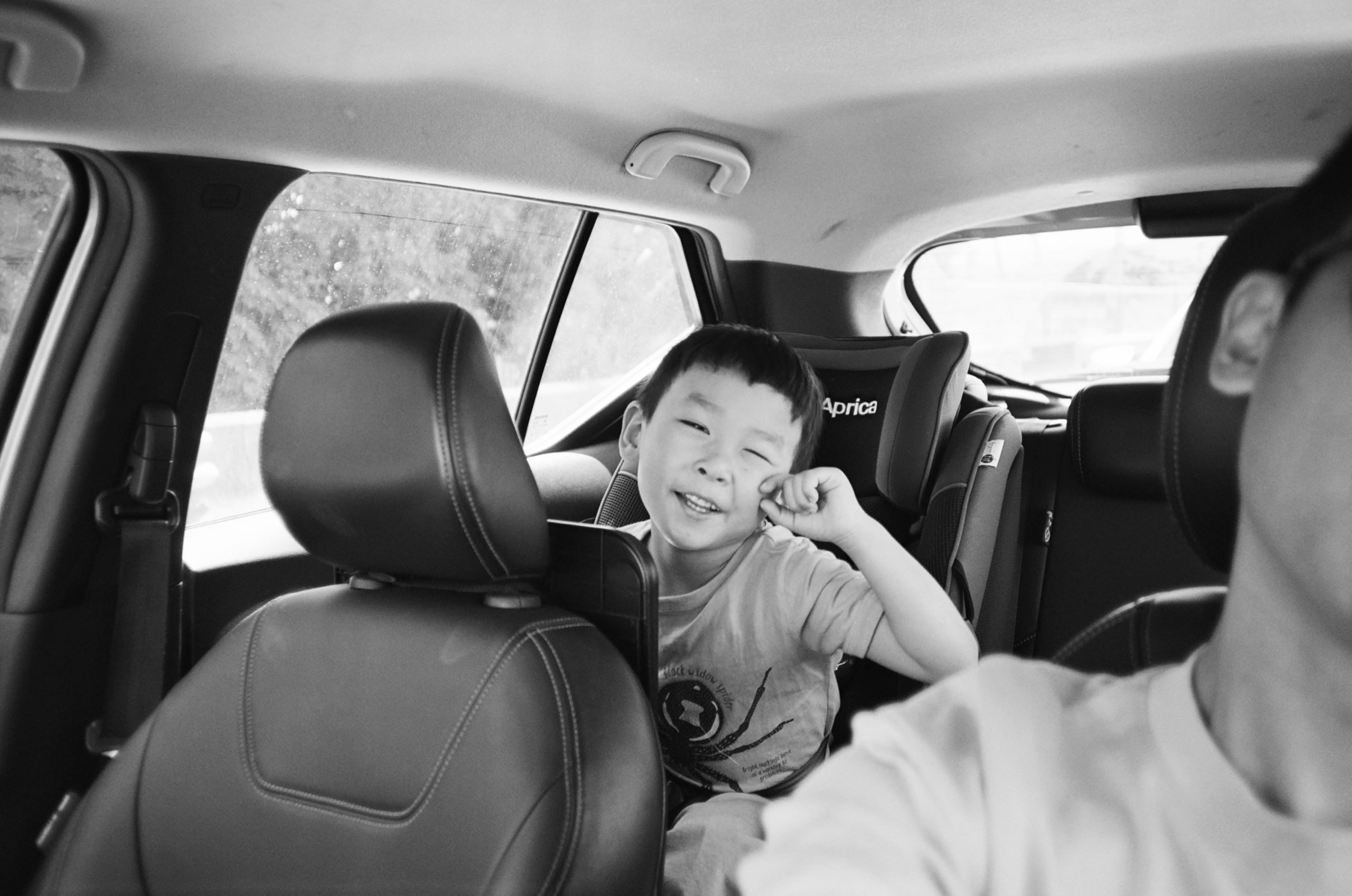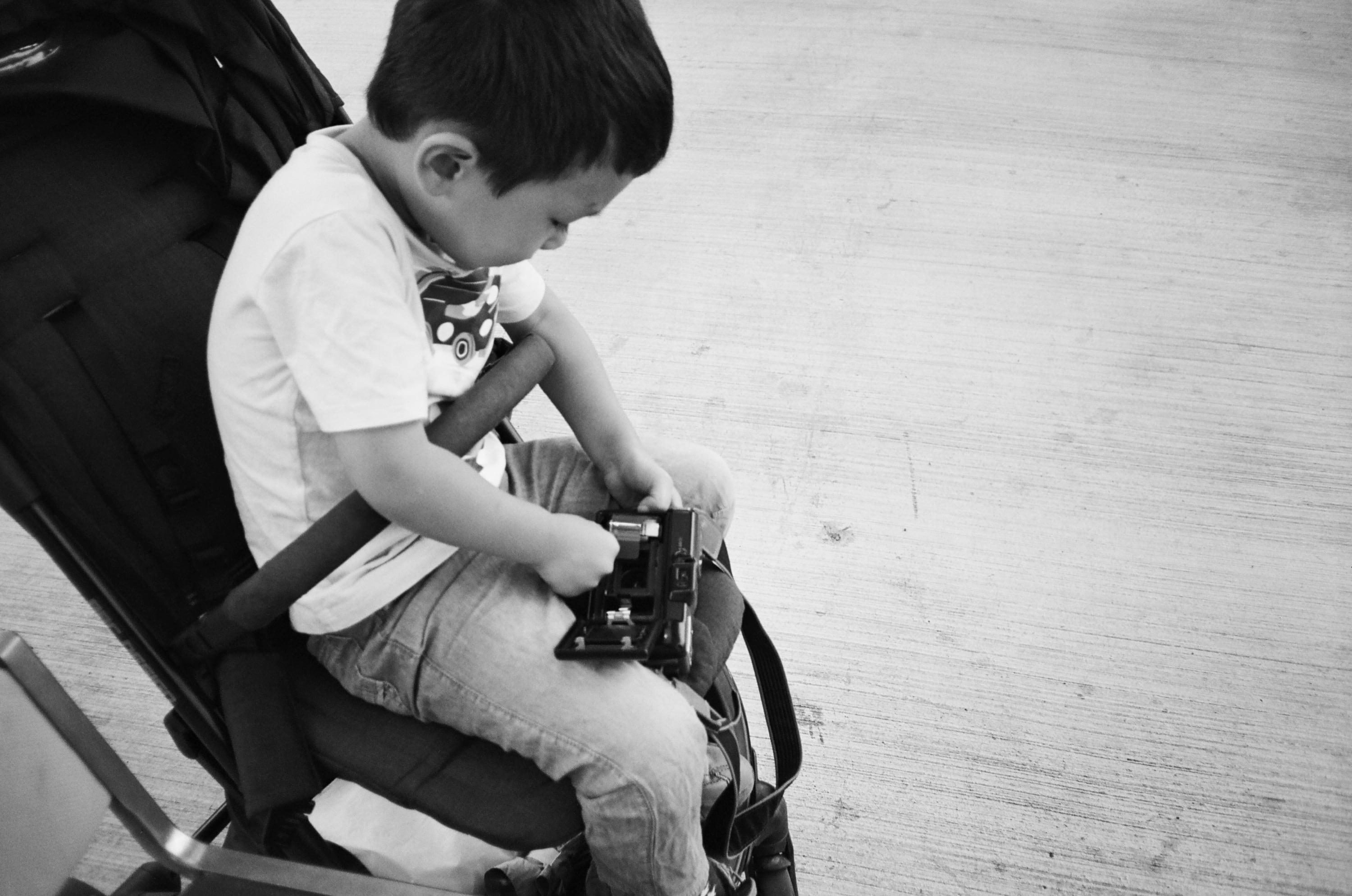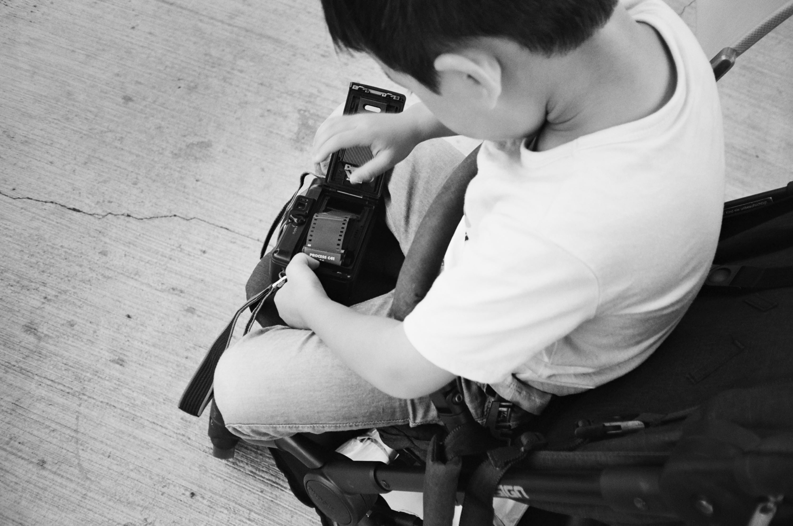 某天和兒子去搭火車,圖為坐在嬰兒推車上安裝底片的四歲半小孩。