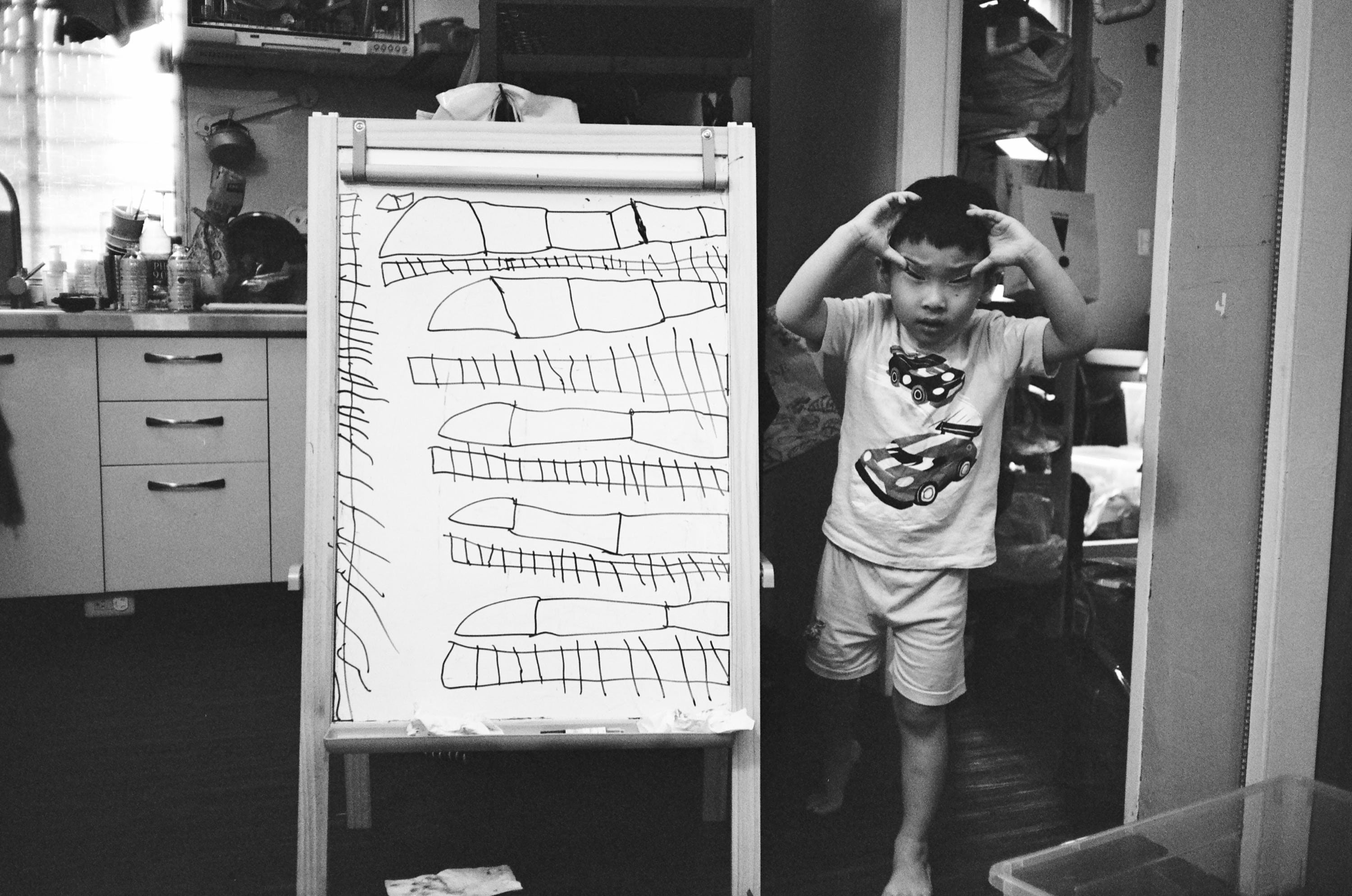 我不知道兒子知不知道他的這些照片有可能會出現在「網路」上,圖為兒子和他畫的火車合影,每台火車下方都有對應的鐵軌,還算合理。