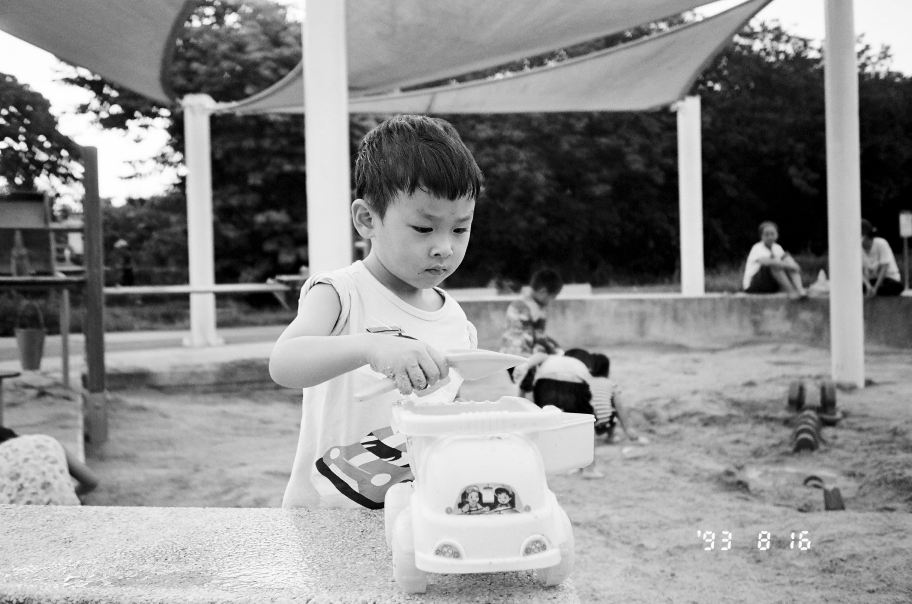 正在玩沙的兒子。我覺得這張照片也將現場監督初代 40mm f3.5 的散景效果呈現得很好,在一般傻瓜相機中,很難見到這種透視的畫面。